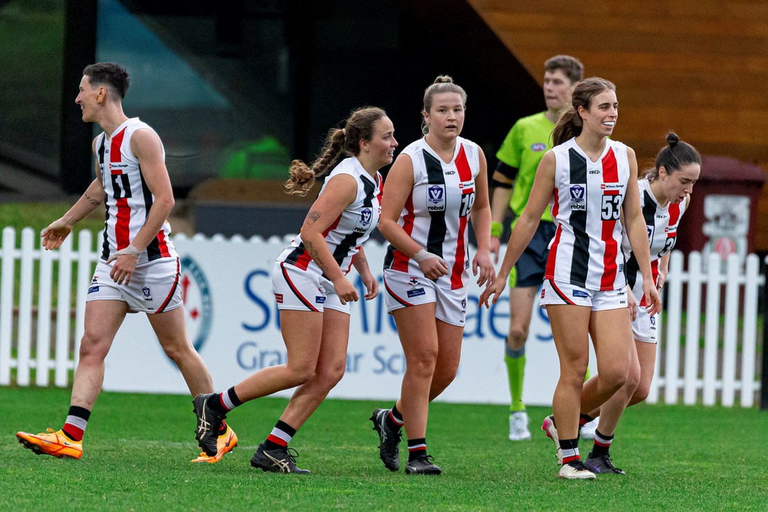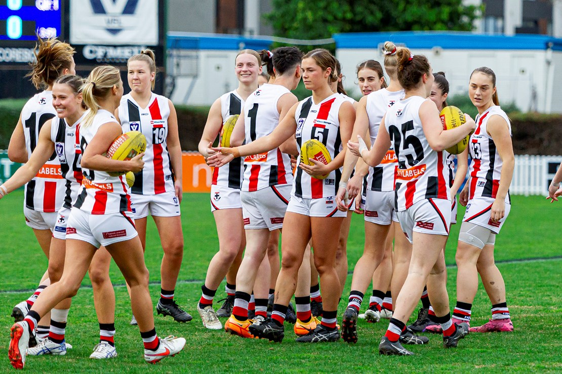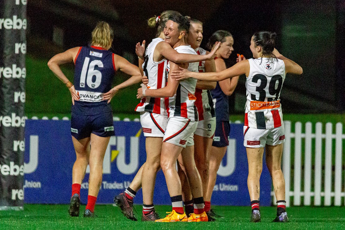 As the final siren sounded, the Saints bench and fans that had braved the cold conditions to support the girls started to cheer as it signalled our spot in this Sunday’s Grand Final against Essendon at ETU Stadium at 12:15pm.