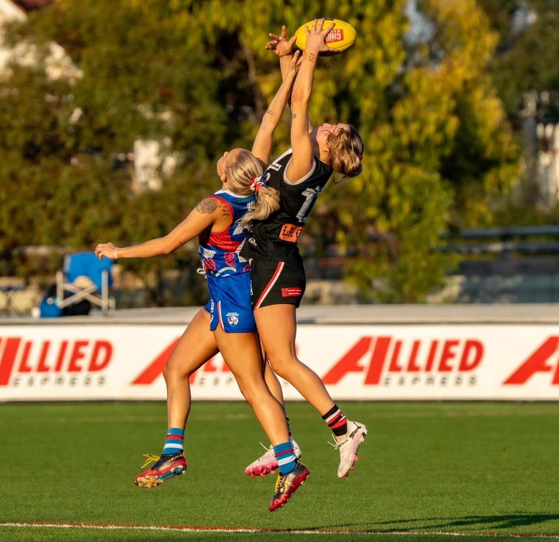 Resisting the Bulldogs’ intense pressure in the initial minutes of the first quarter, in what were pristine conditions for football, we began to fight our way back through strong overhead contested marks and precise chip kicks from Deanna Jolliffe. Midway through the first, Chloe Hunt skilfully won a rucking infringement freekick in the forward 50, leading to a successful set shot from 35m out for the game’s first goal.