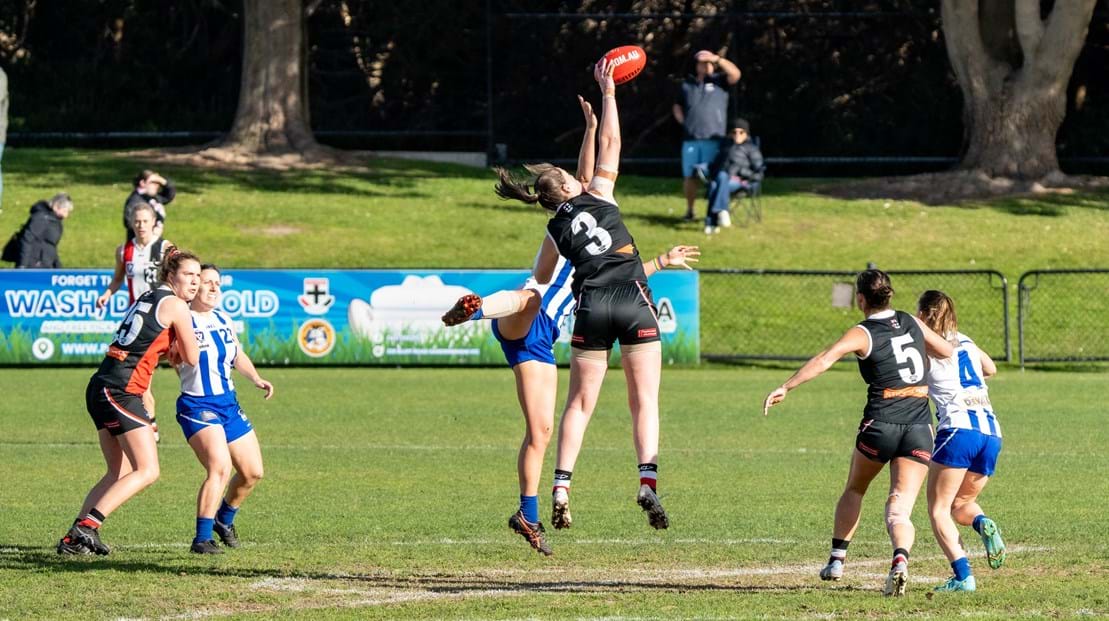 Other standout performers included Margaret Kershaw (12 disposals, 21 hit-outs and a goal), Madison Capsalis (11 disposals, eight clearances and seven tackles) and Saints Co-Captain Tayla Kearns (11 disposals and a game high five marks).