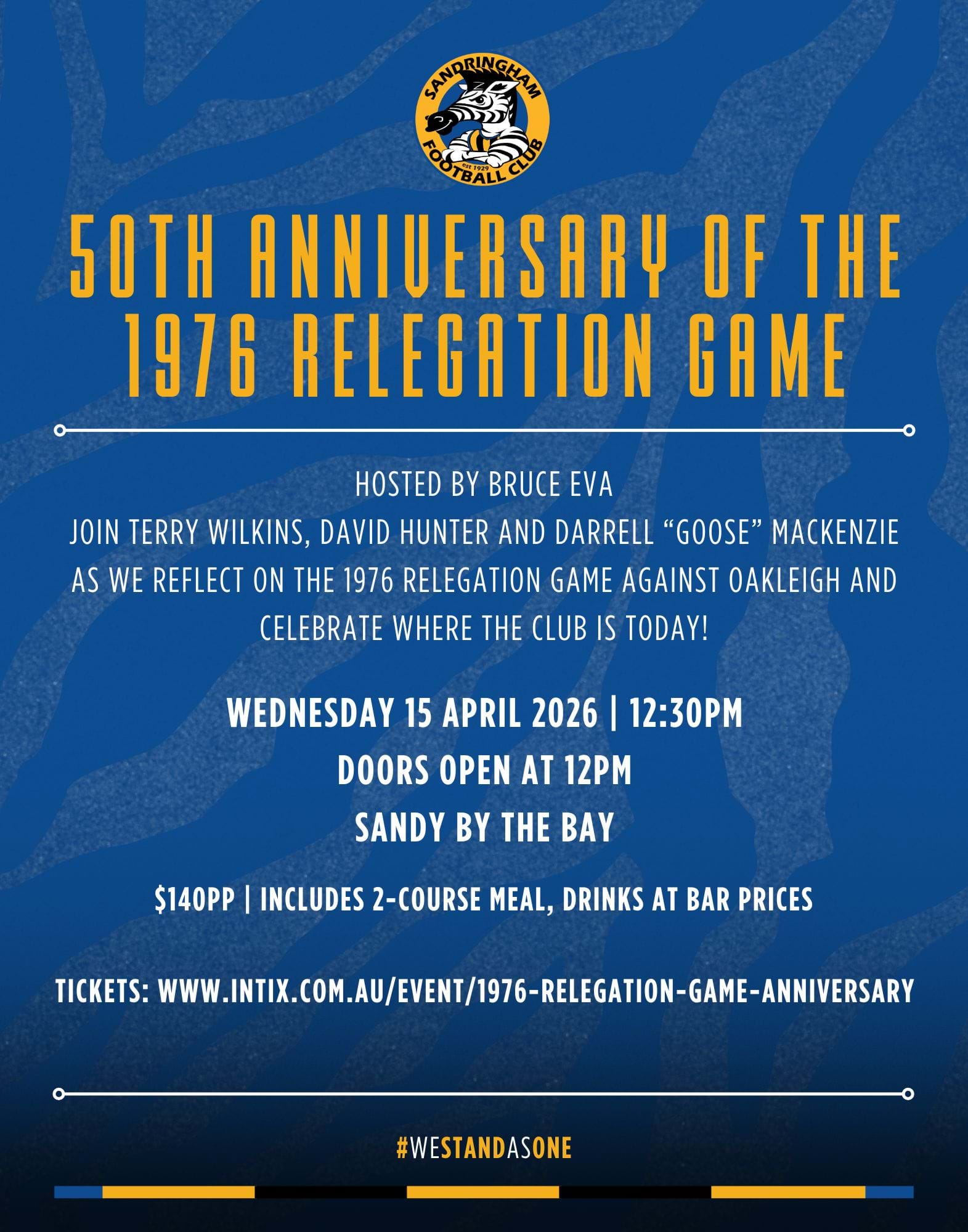 This event marks 50 years since the famous game that would see one of the two teams relegated - Sandringham had never in its history been relegated, but the pressure was on as Oakleigh had won the earlier encounter that year.