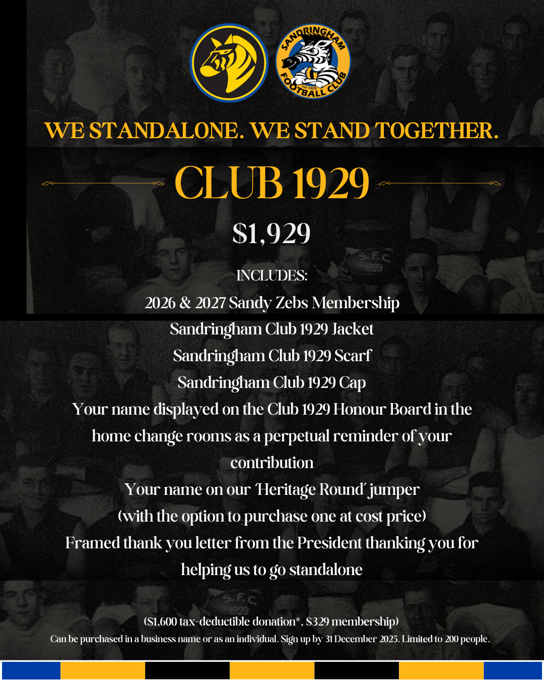 - Your name displayed on the Club 1929 Honour Board in the home change rooms as a perpetual reminder of your contribution