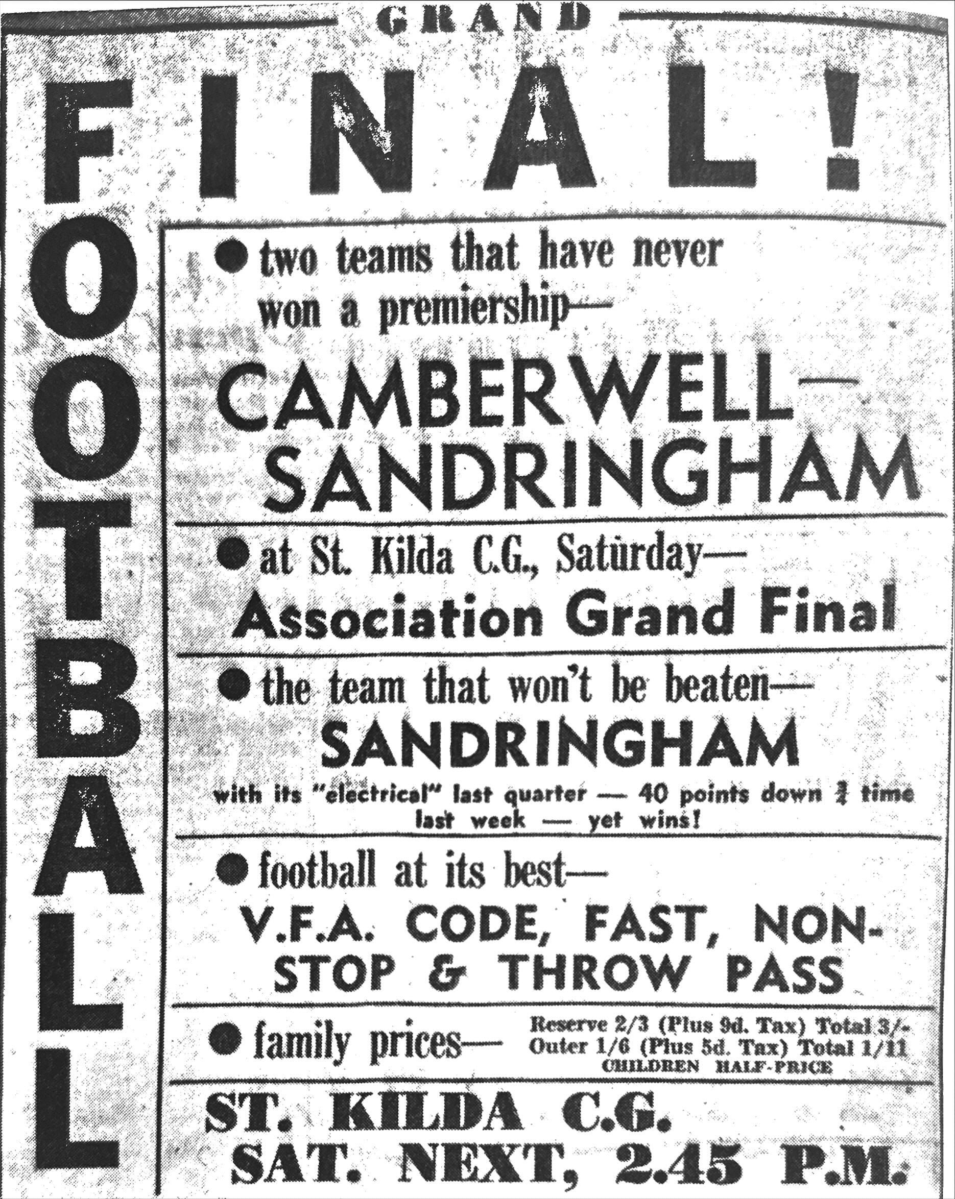 In a maiden grand final appearance, Sandringham faced Camberwell in front of a crowd 30,000 strong at the St Kilda Cricket Ground. Camberwell led only by two points at the third quarter time break. This lead was insufficient for a fit Zebras side who stayed in the game to the very end. It was after the full-time siren that the Zebras extended their lead to seven points and secured their first ever Premiership.
