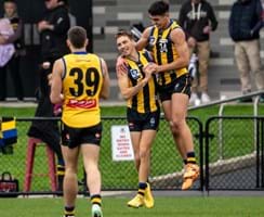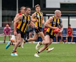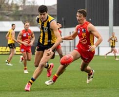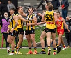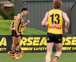 Wet and slippery conditions in the second were ideal for our style of football, as contested bull Mattaes Phillipou sprang into action notching up a game-leading eight tackles. Although the SUNS started to exhibit fluid ball movement from their defensive half, no one could deny the exceptional skill of Collard as he adeptly tapped the ball ahead, veered back inward, and impressively curled in a goal from 35m away. We headed into half-time three-points up.