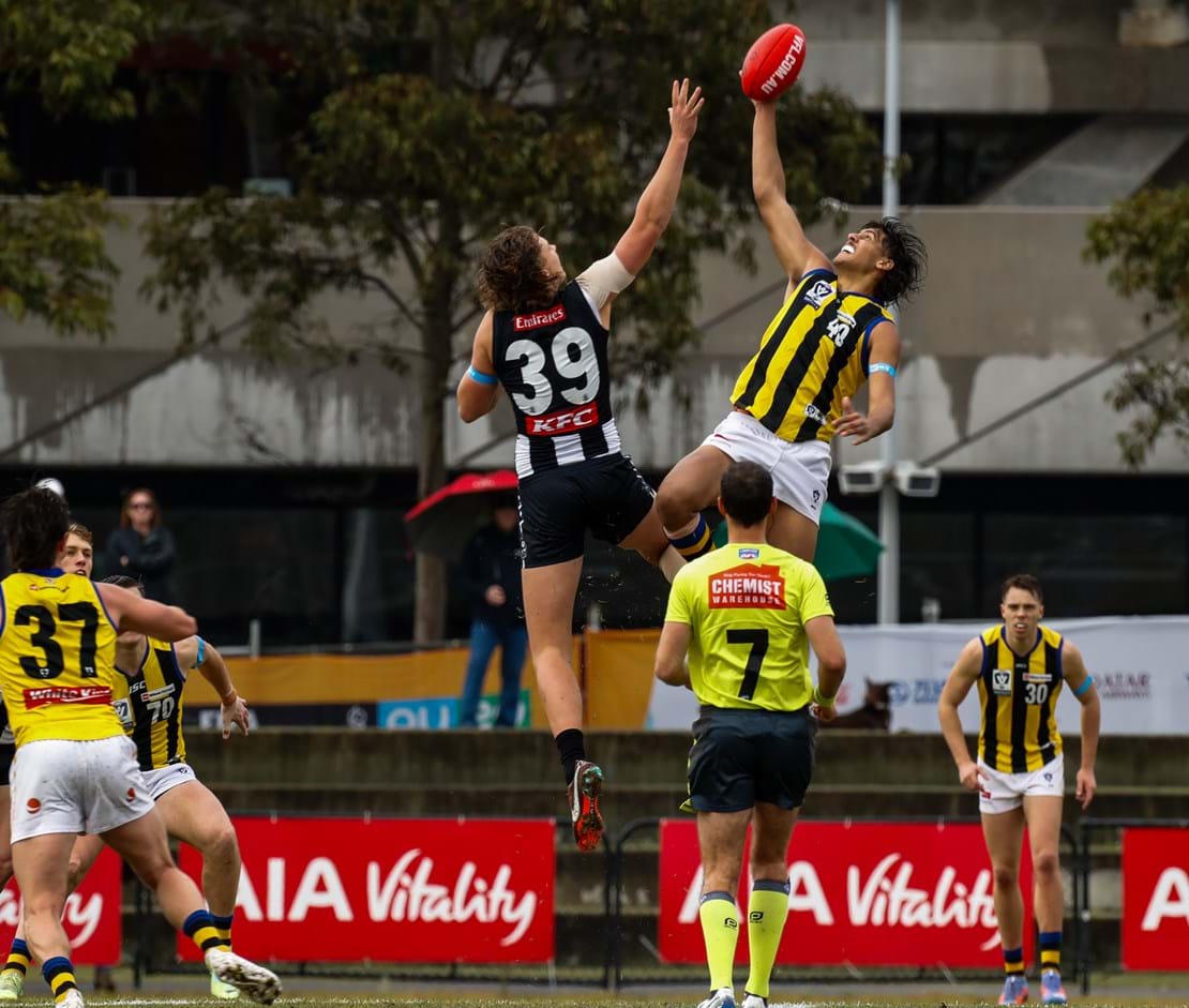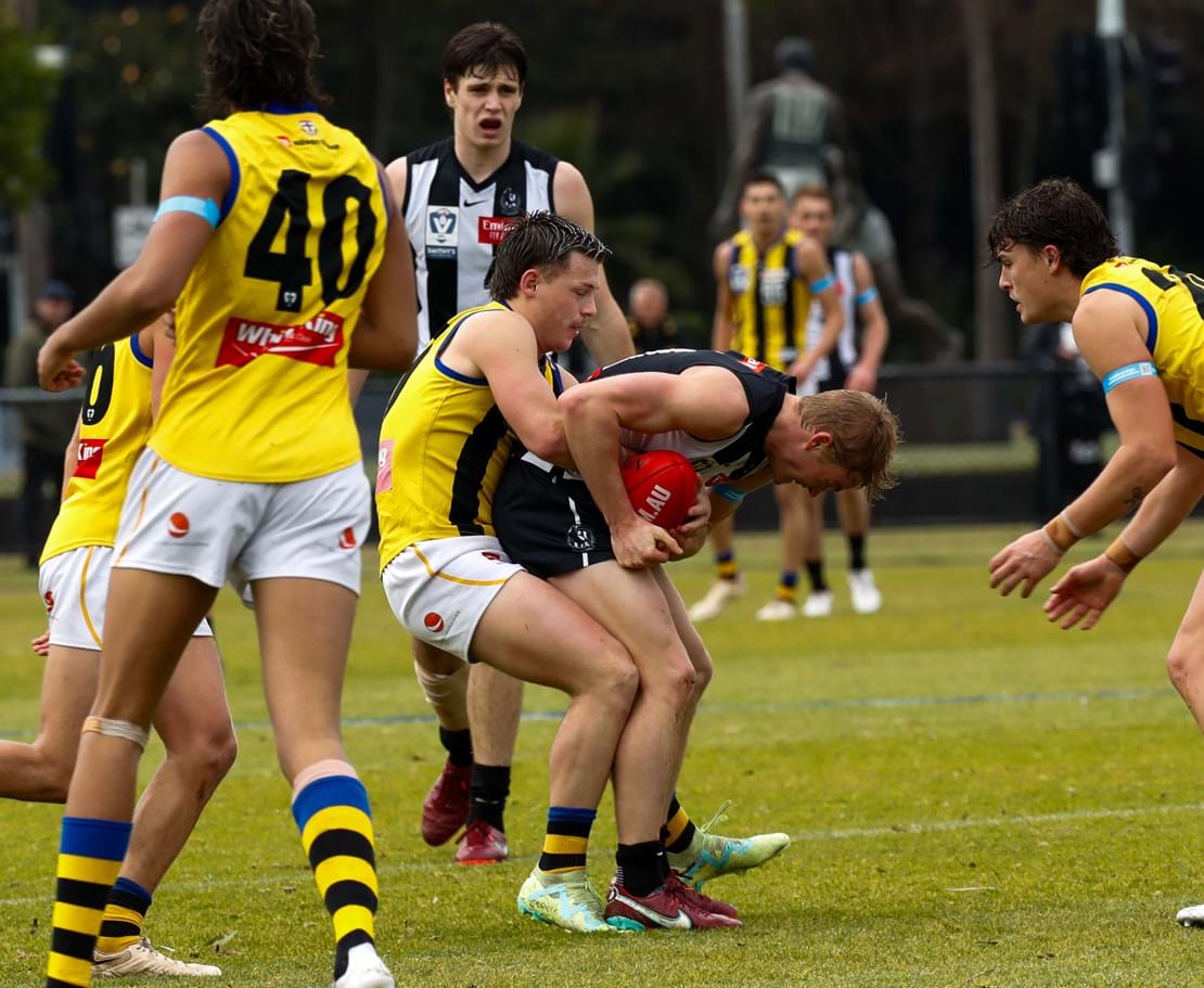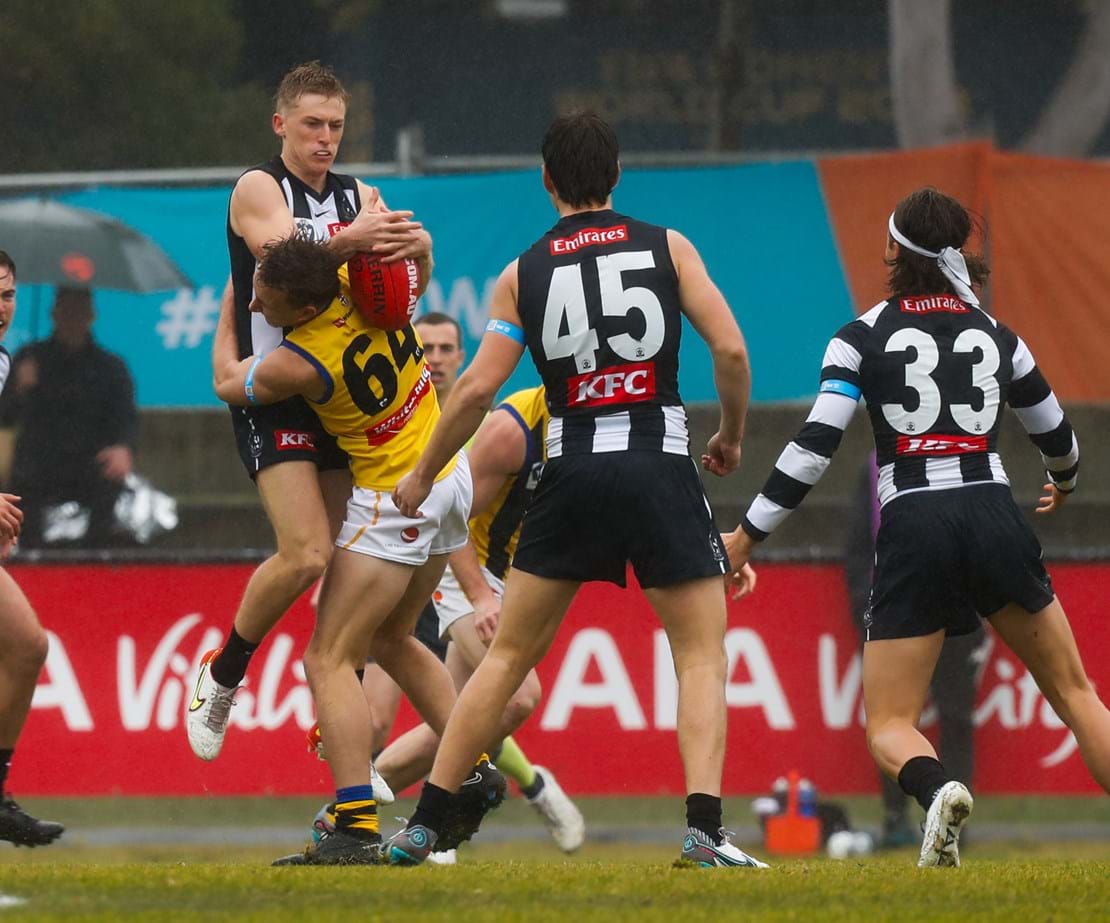 Down back it was AFL-listed Tom Highmore and Oscar Adams holding down the fort, combining for 13 disposals and 4 marks to hold the strong Magpie attack at bay. Highmore had a great courageous individual effort going back with the flight to spoil the ball out of bounds deep in defence.