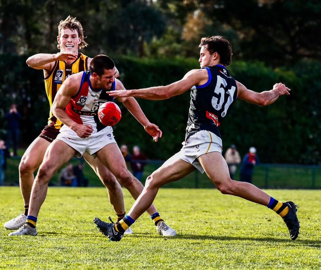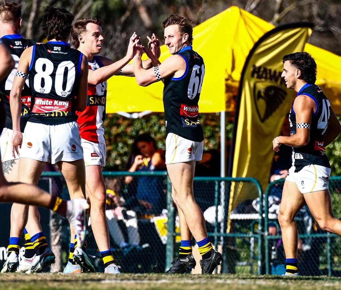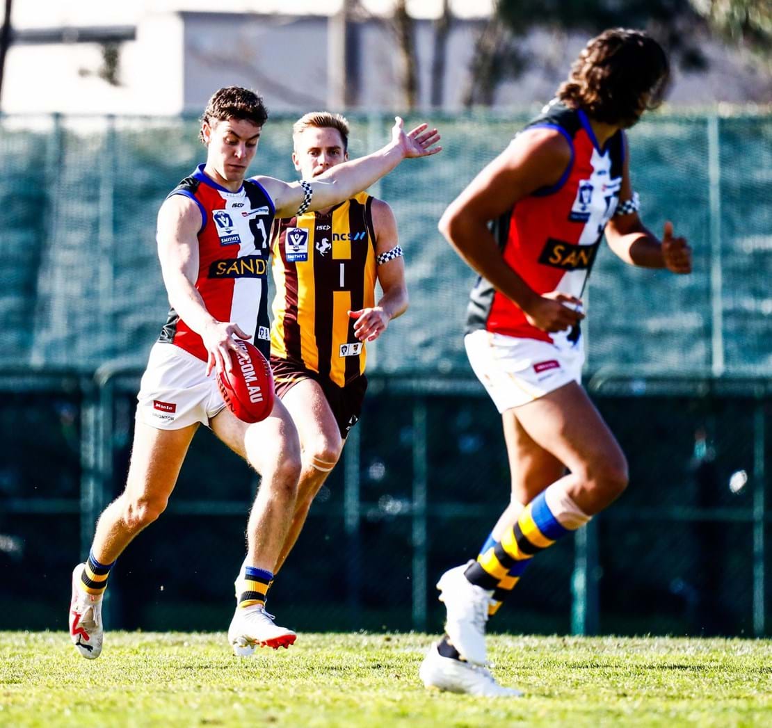Sandringham kept the hopes of an upset victory alive as Lohmann, despite seemingly being wrapped up in a tackle by a Hawks’ defender, showed great strength to shoot a 20-metre handball to Allison who kicked a goal off the outside of his boot.