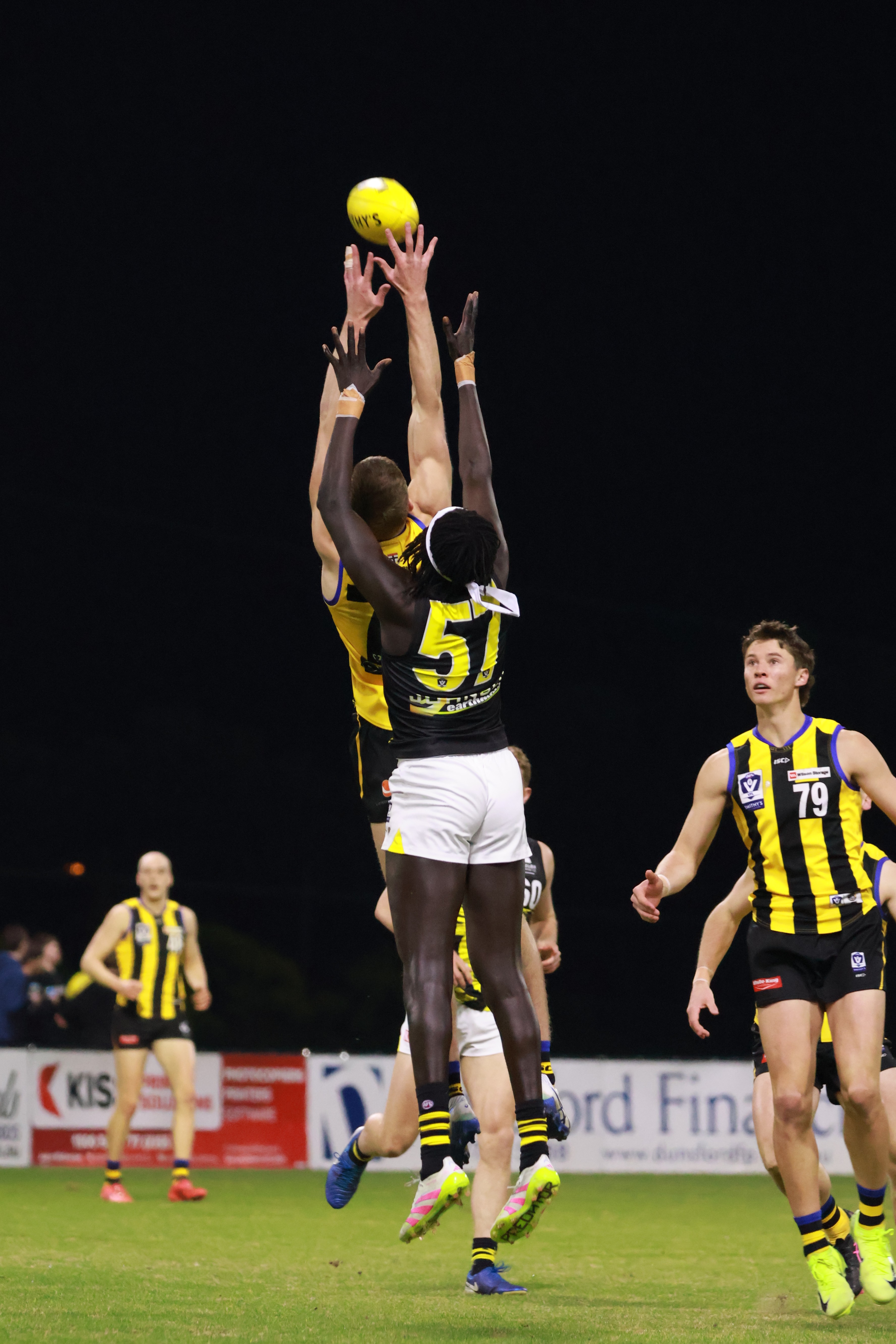 With the breeze behind us in the second term, we played some of our best football of the season. A coast-to-coast play finished with Lance Collard kicking truly after smart work from McKenzie, who soon followed up with a goal of his own from a stoppage. Then came the highlight of the night - Arie Schoenmaker launching an incredible 70-metre bomb from the middle that bounced through to the delight of the crowd. James Barrat added another from long range, Ned Maginness clunked a strong contested grab and converted, and Orchard nailed his second. By half-time, we’d piled on six goals for the quarter and cut the margin to just nine points.