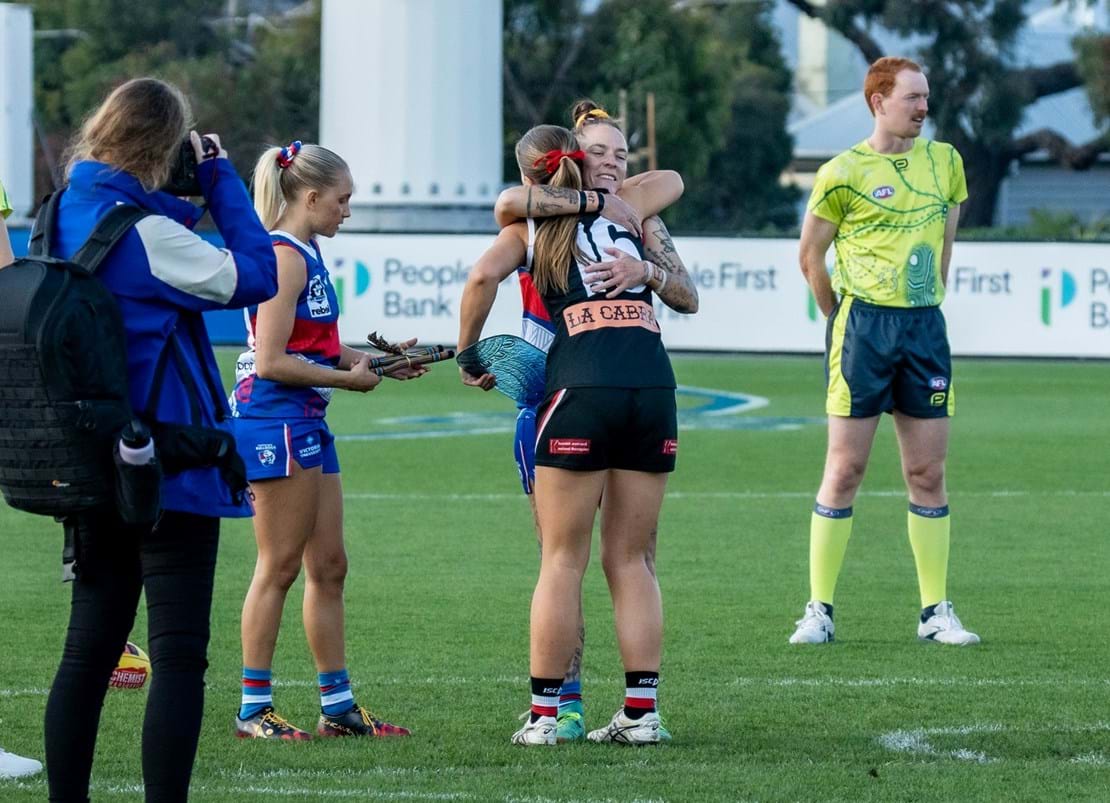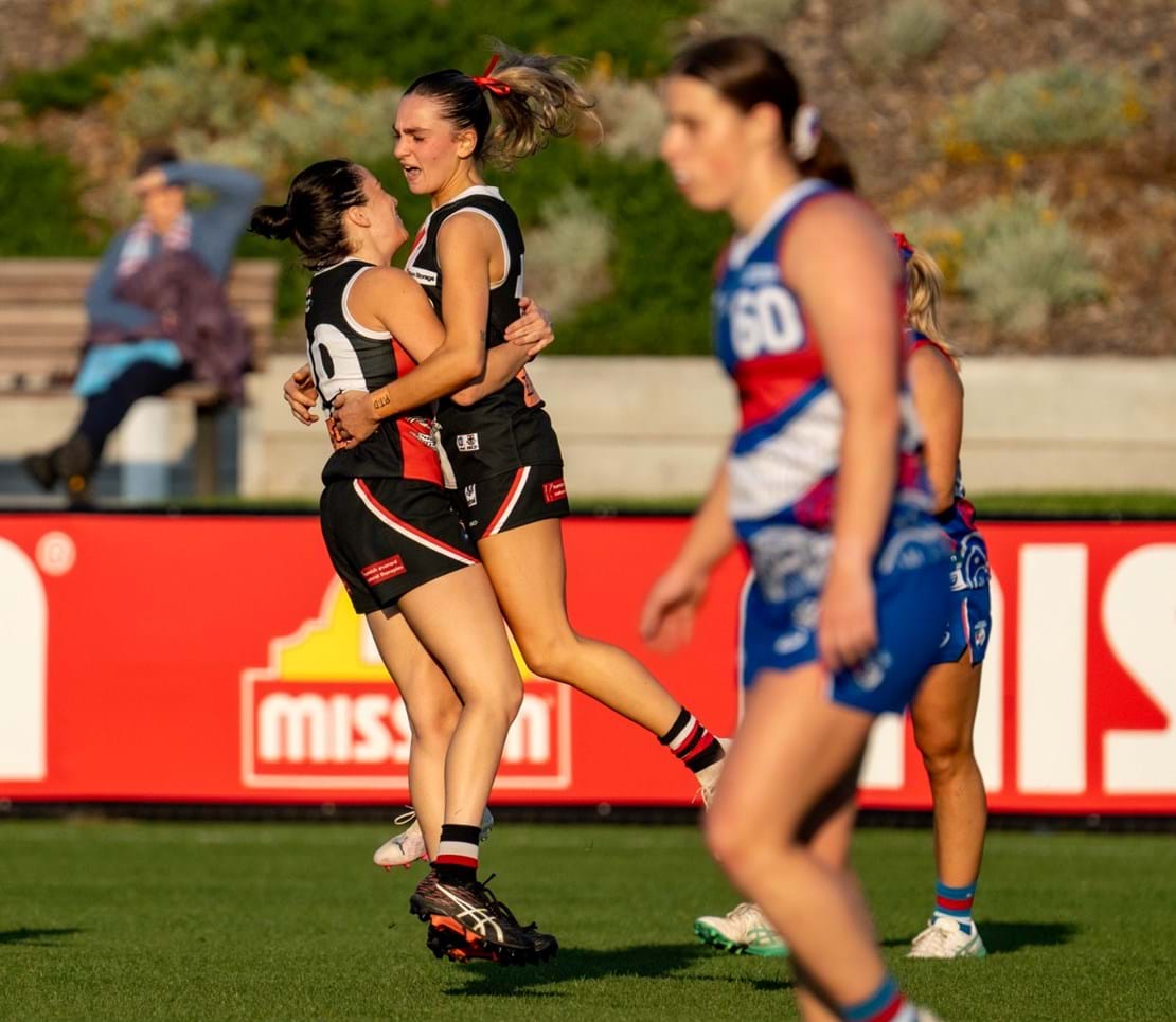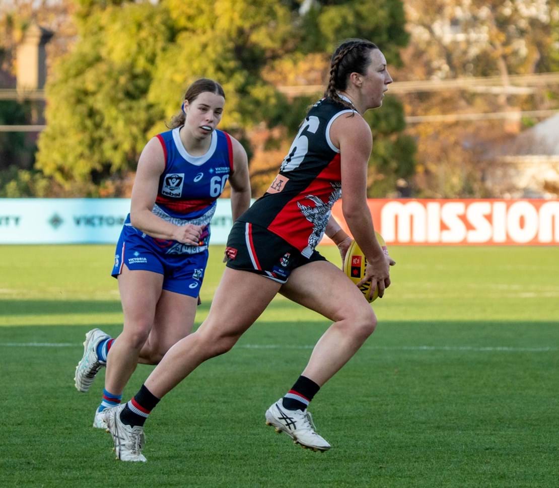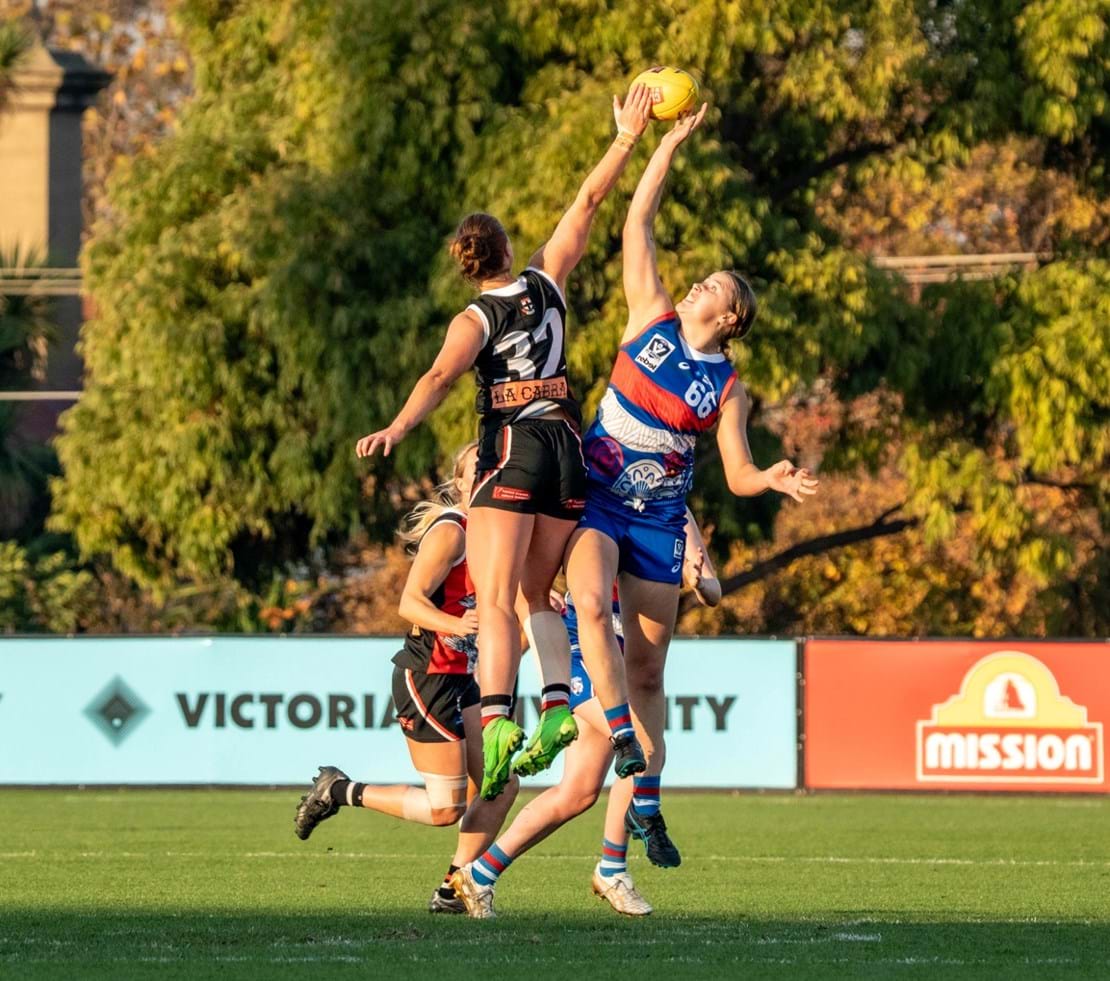 Resisting the Bulldogs’ intense pressure in the initial minutes of the first quarter, in what were pristine conditions for football, we began to fight our way back through strong overhead contested marks and precise chip kicks from Deanna Jolliffe. Midway through the first, Chloe Hunt skilfully won a rucking infringement freekick in the forward 50, leading to a successful set shot from 35m out for the game’s first goal.