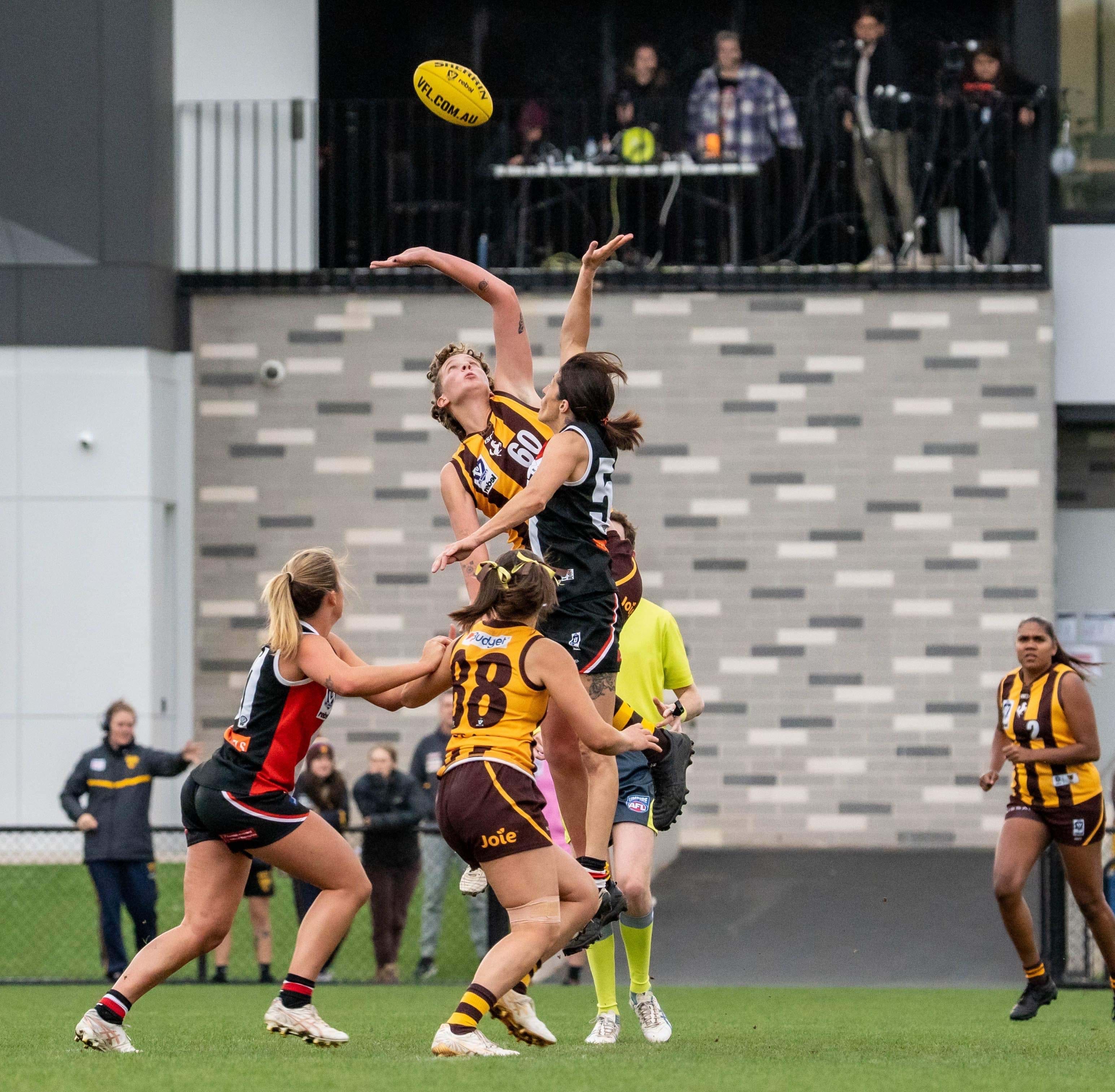 De Angelis utilised her power to burst through the stoppage, hammering the ball straight through the middle to pick up where she left off last week. Following a return to the centre, the Saints maintained their early pressure, presenting well to gather multiple intercept marks within the first five minutes.