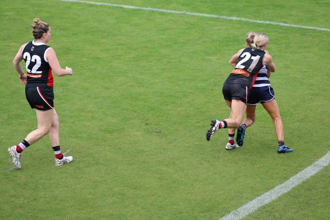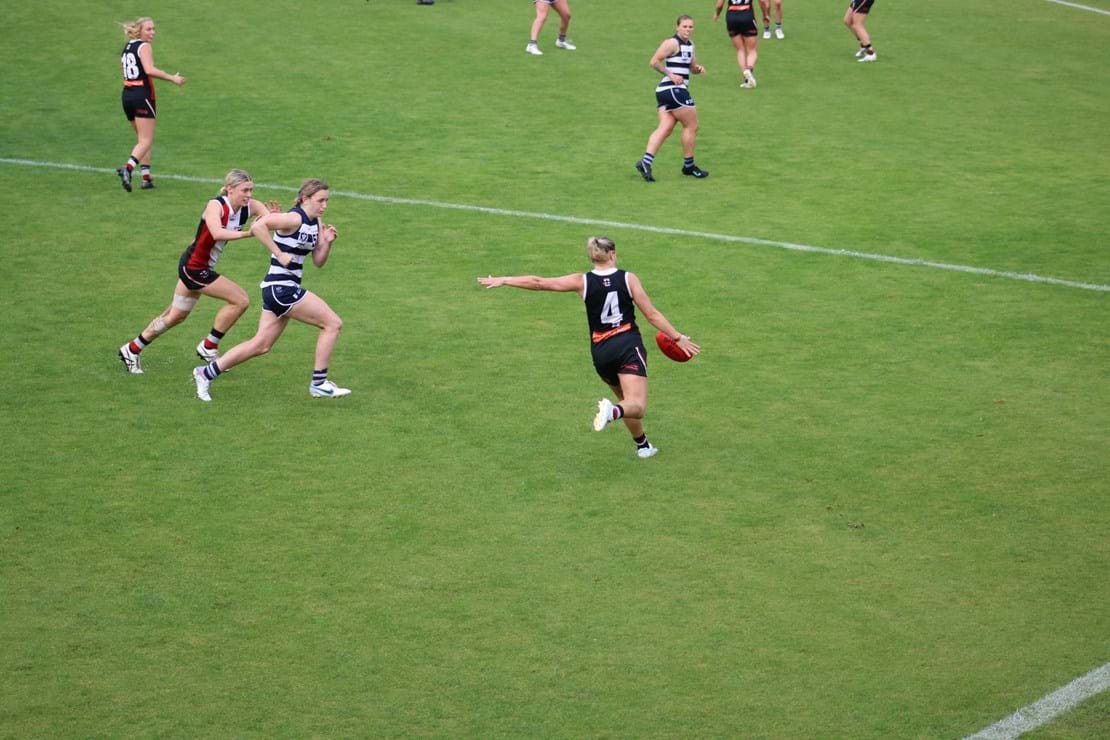 Geelong again found ways to dominate around the centre of the ground but it didn't stop Hynes at the twelve minute mark competing at a one on one contest at ground level, pressurising Geelong to stay clear of the corridor. Saints forward worked their way down the ground, bringing extra pressure at each contest, De Angelis and Jemma Webster controlling the play at the half backline.