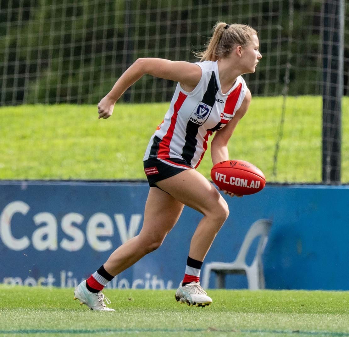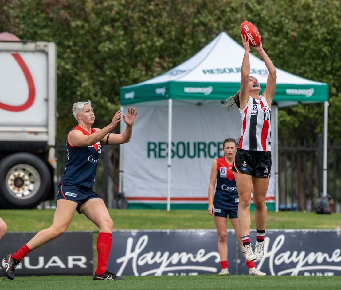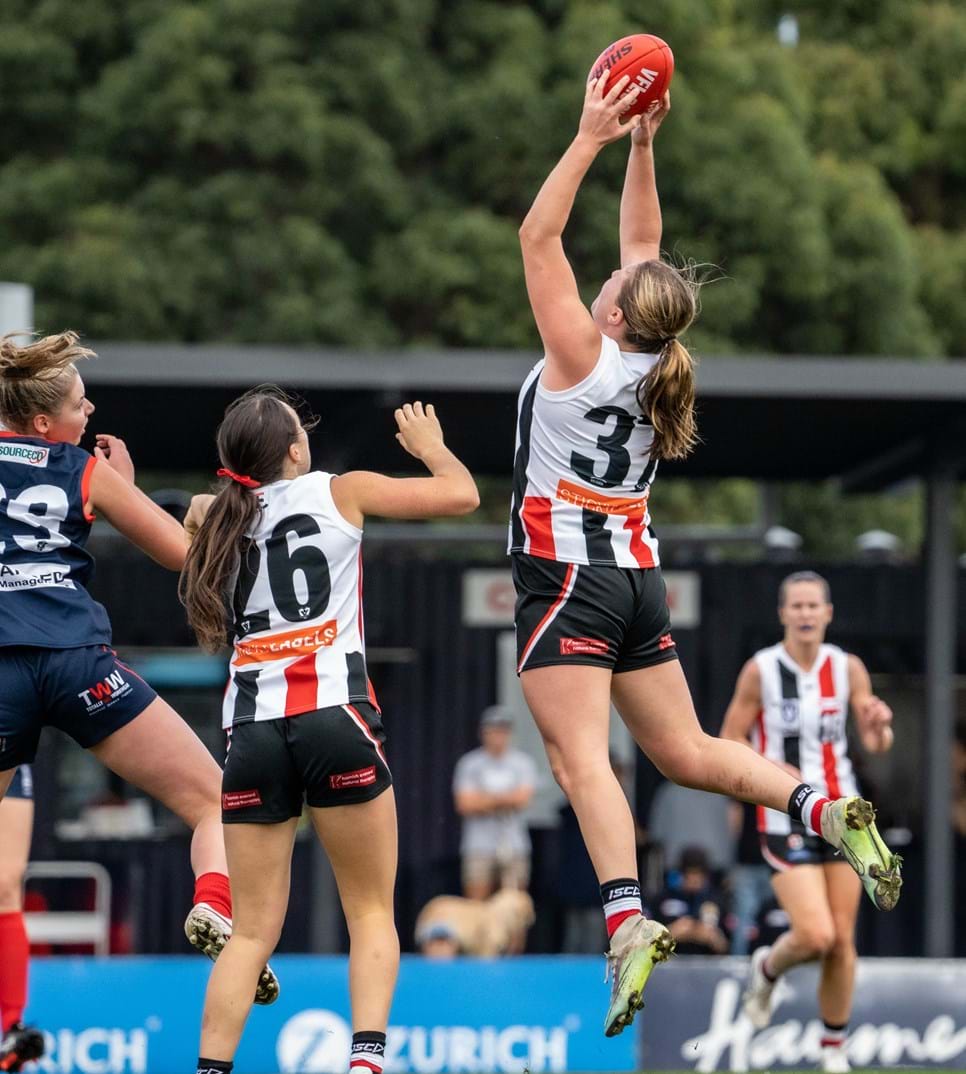 Saints’ goalkickers all kicked multiple goals with Lucy Burke leading the way with four, debutant Abbey Tregellis slotting three straight, and the ever-reliable Gaby De Angelis chiming in with two majors. In the middle of the ground, it was Margaret Kershaw who battled all day against the taller ruck opponent to lead the disposal count with 24 touches, including 20 kicks, alongside nine tackles and 14 hitouts. Her midfield brigade assisted her, with Michelle Podnecky recording 12 disposals and four tackles, and Jemima Wrigley claiming nine touches and laying an equal game-high nine tackles.