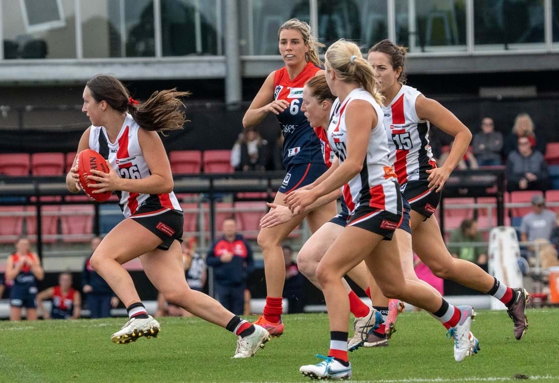 The Saints began to dominate the tackle count this quarter as De Angelis, Nicki Cormack, and Deanna Jolliffe all laid strong tackles to force stoppages forward of centre. The one percenters also began to show with Grace Hodder completing two great unselfish shepherds on the wing to allow her teammates to move the ball up the ground successfully.