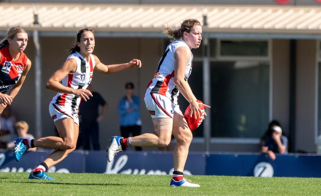 Midway through the second quarter, Ripari took a good mark on the wing and was able to find Stuart on the run at centre-half-forward. Stuart shrugged a tackle and hit Olivia Flanagan inside 50 who went back and slotted our first goal for the match.