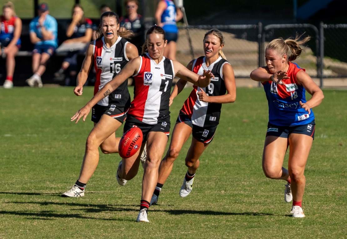 A quick response from Casey, who won the next centre clearance, was stopped by an impressive run down tackle from Jollife, preventing yet another Casey goal attempt. Shortly after, an intercept mark from Georgia Ricardo in the Demons' 50 sent the ball straight back up the Saints way, resulting in a high free kick to Ryan who got our third and final goal.