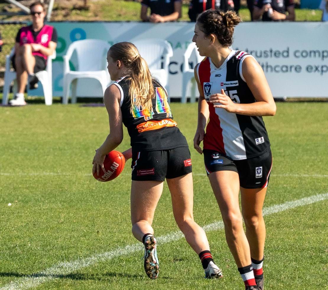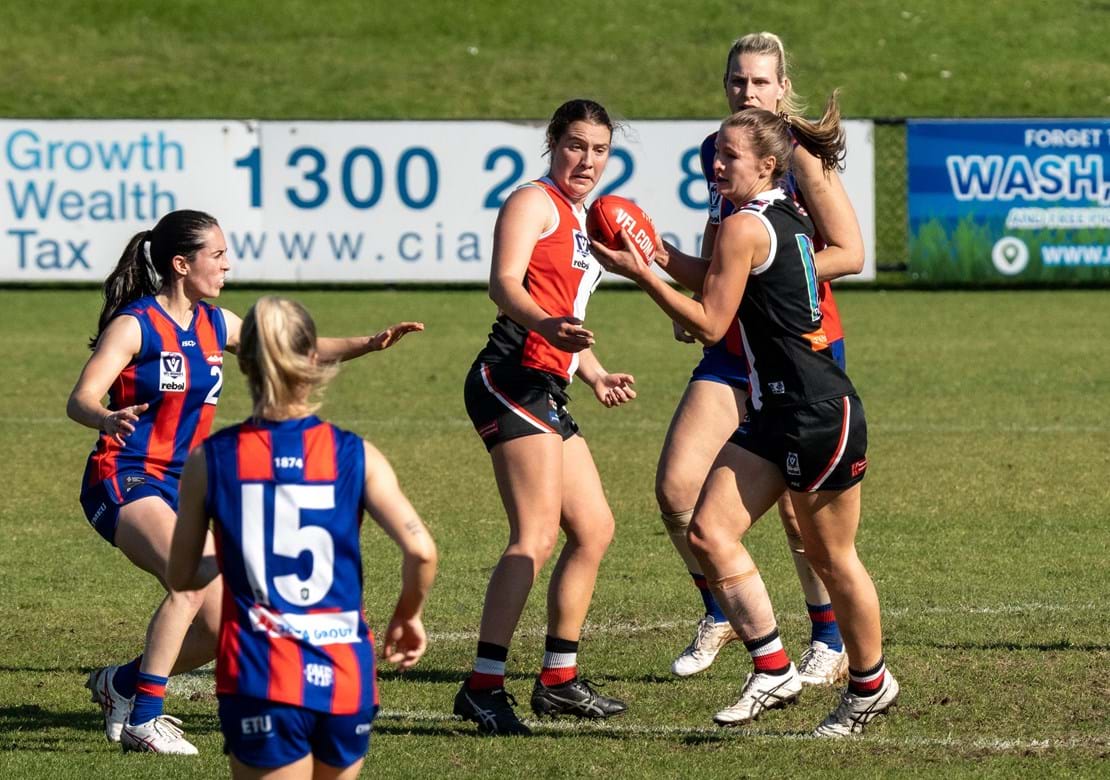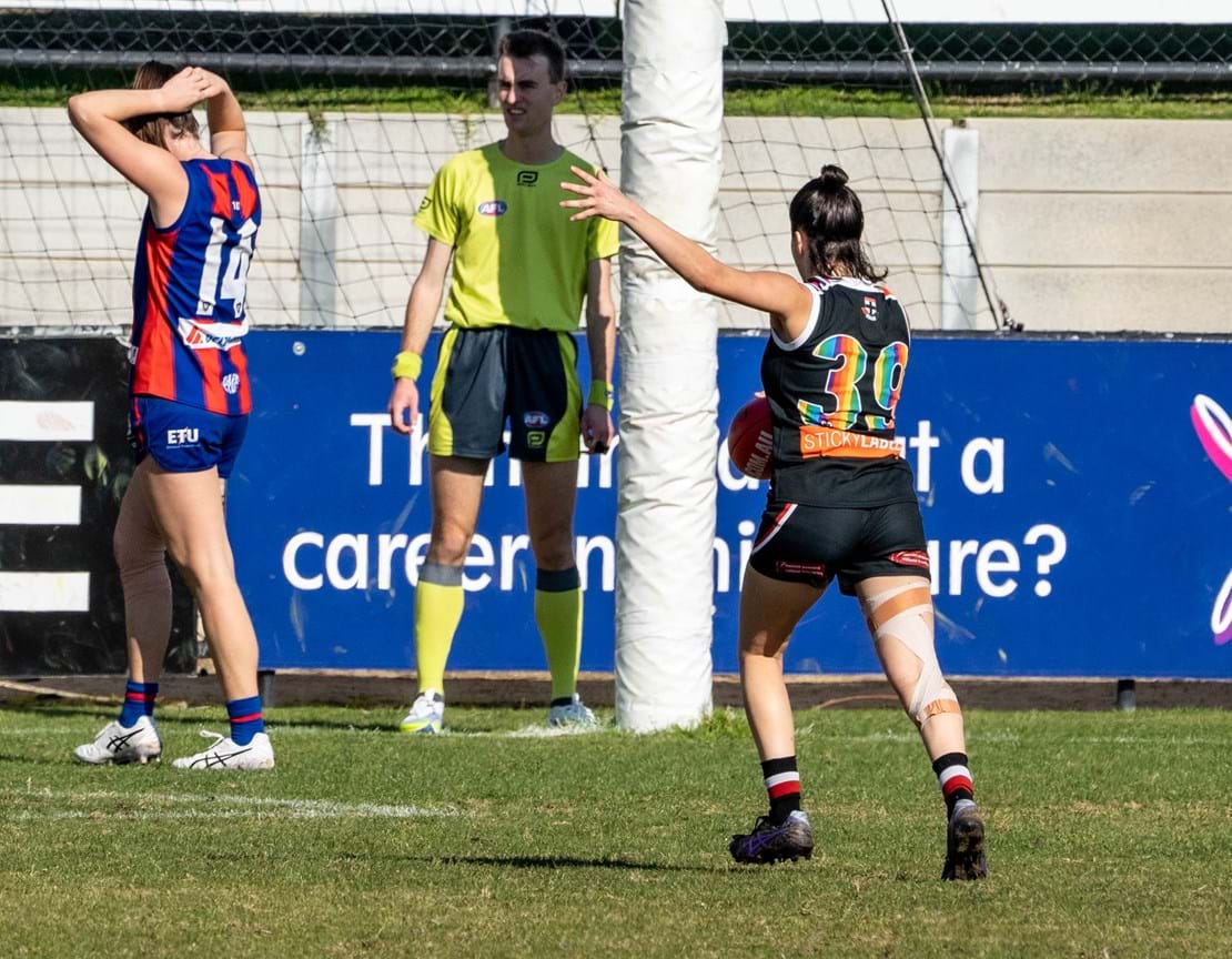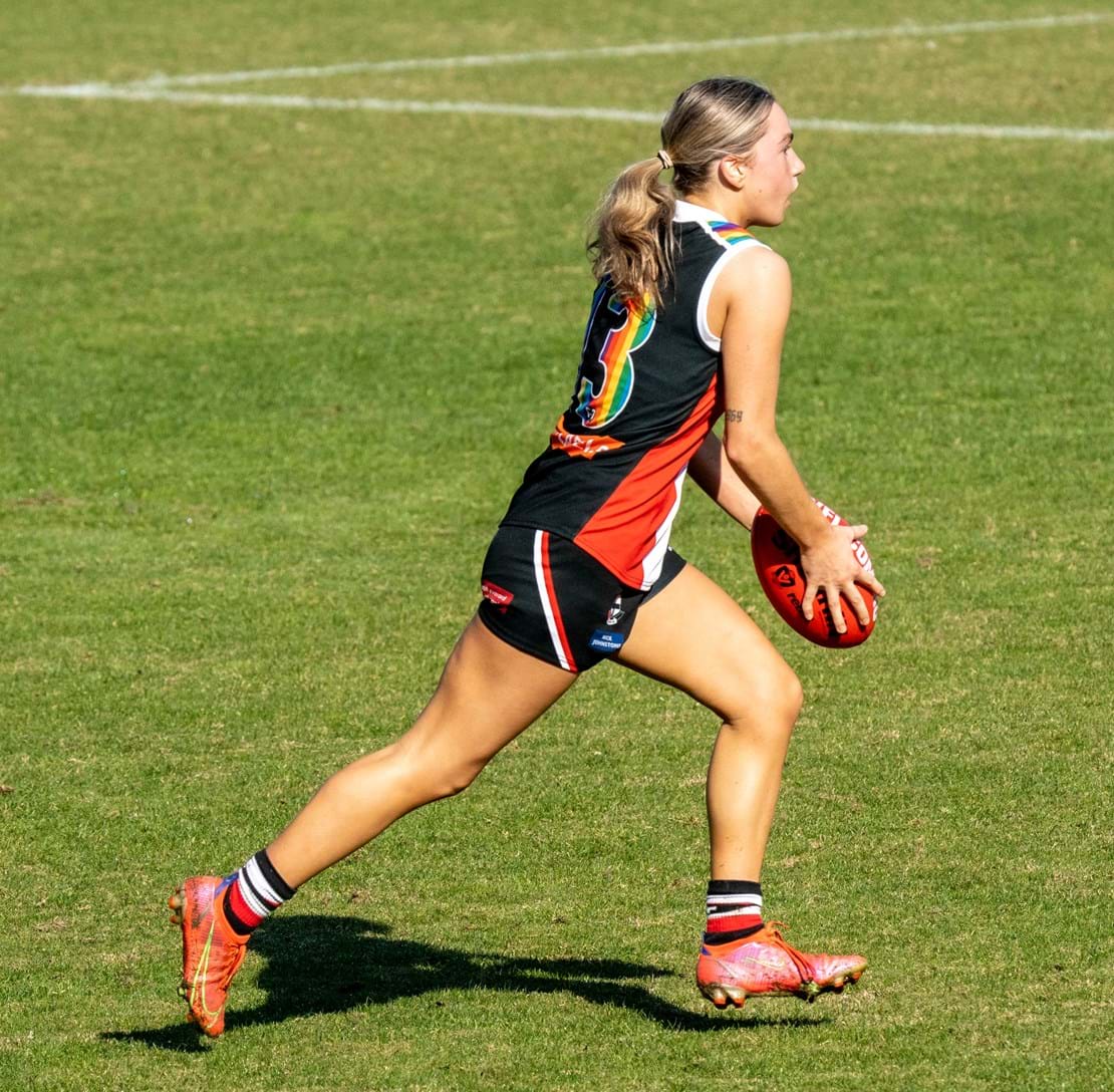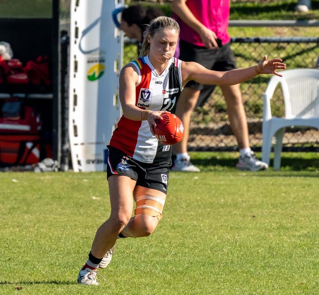 Laing sustained her brilliant run and carry on the wing with six third quarter touches, whilst Madi Capsalis began to string together some nice plays to record seven disposals of her own and lay a crunching chase down tackle in the middle of the ground to win a free kick for holding the ball. Caitlin Matthews also had a great defensive effort in third term, taking a great diving intercept chest mark at half back from Port Melbourne’s centre clearance.