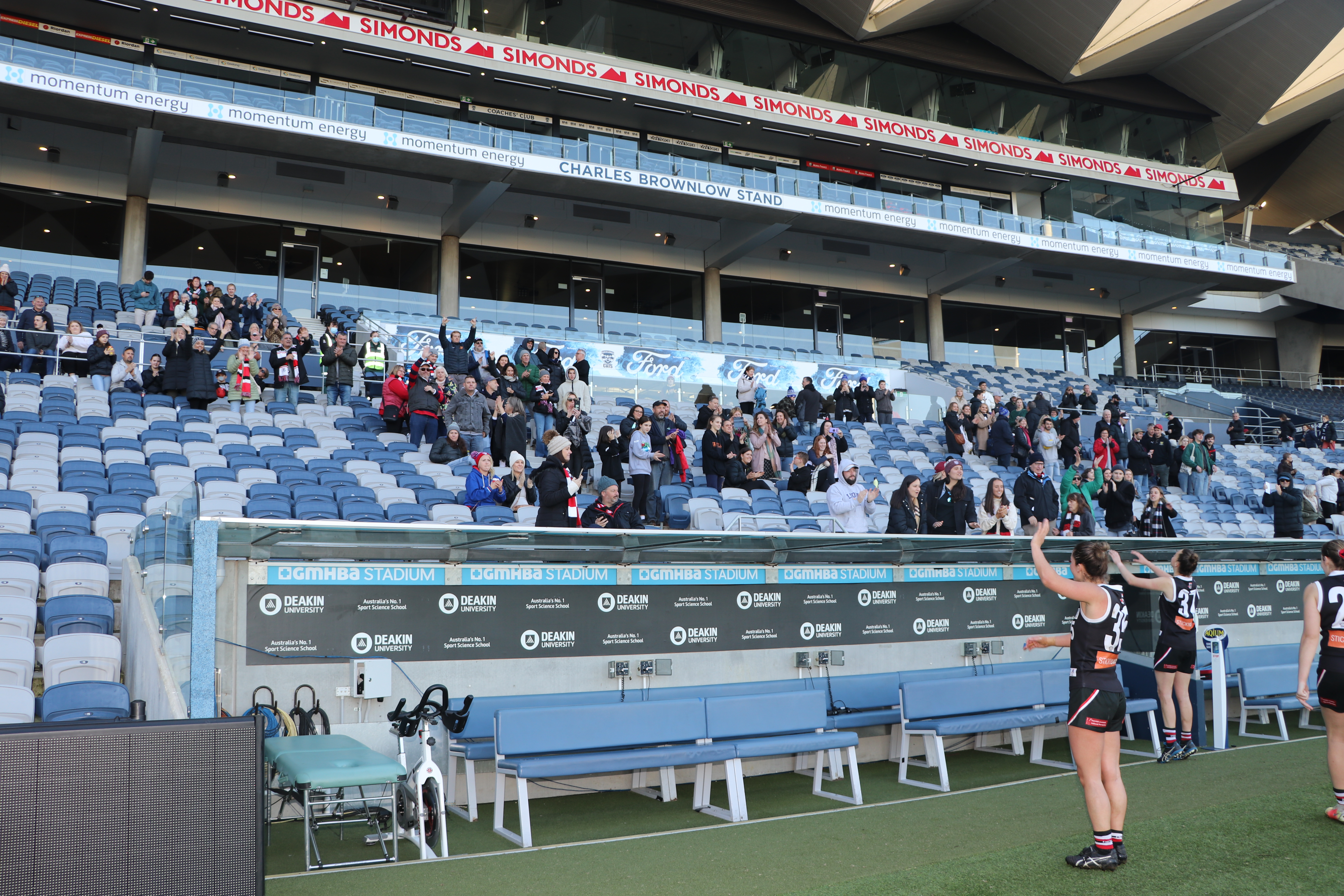The travelling Saints fans were noticeably more vocal after the De Angelis goal as cheers of “Let’s go Saints” reverberated around GMHBA Stadium.