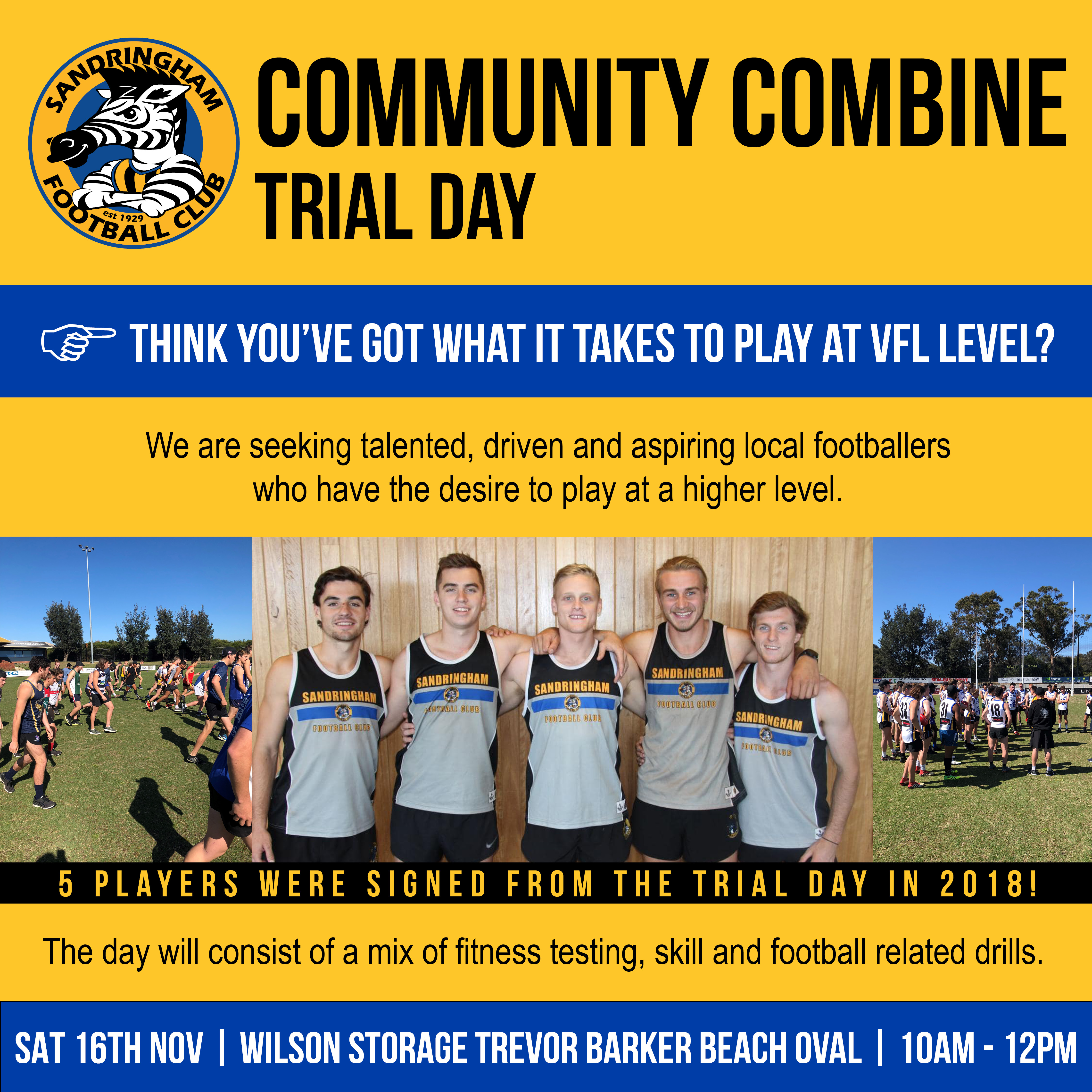 After the success of the inaugural community football combine last year, the Sandringham Football Club is pleased to announce the Community Combine Trial Day for 2019.
