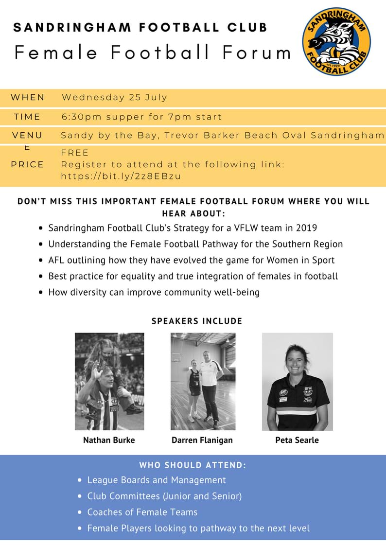 This forum is a very exciting step towards Sandringham’s desire to provide females with the opportunity to play football at the highest state league level.