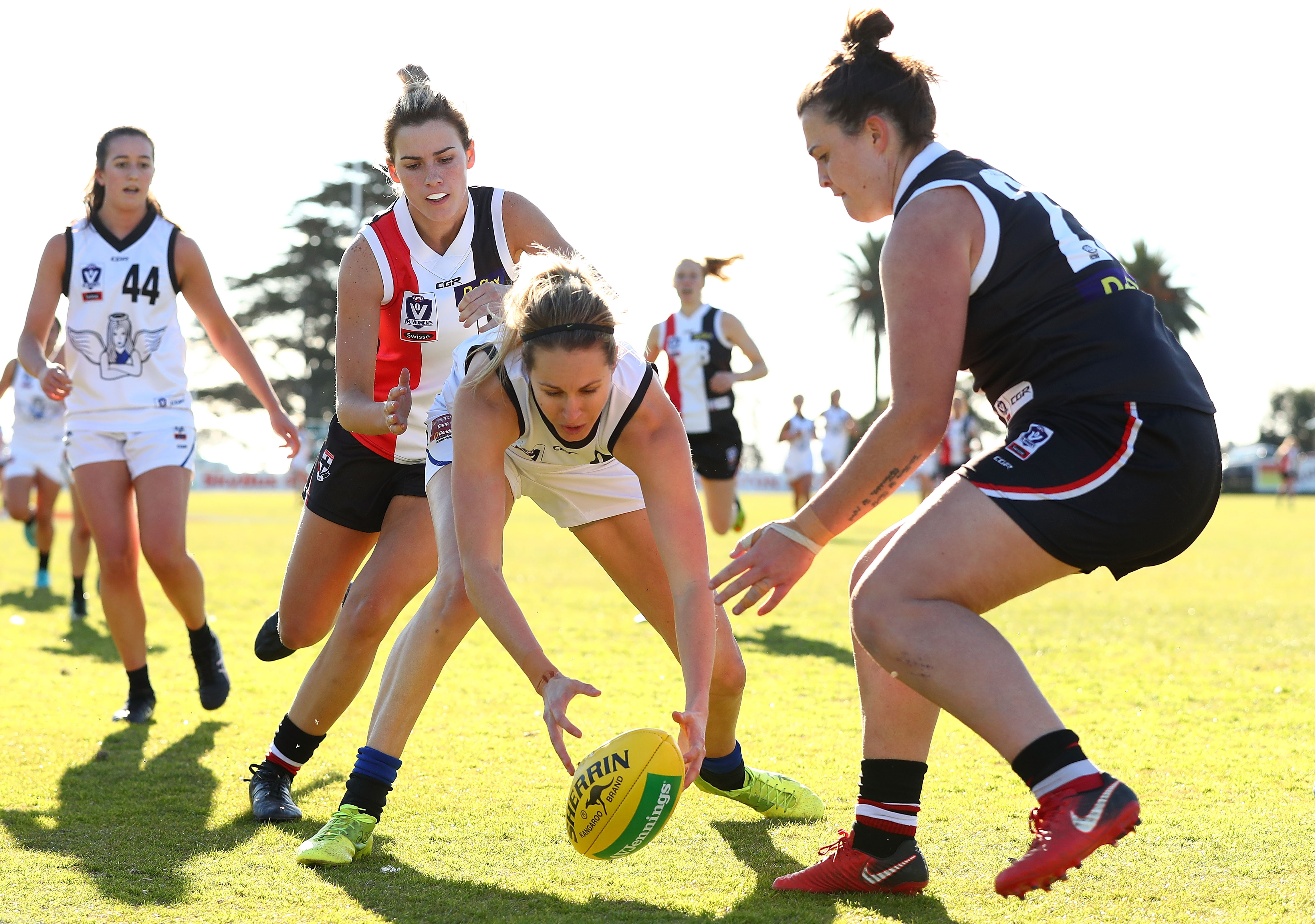 Kira Price of Melbourne Uni (L) and Jasmine Rolland of the Saints compete for the ball during the round 11 VFLW match between the Southern Saints and Melbourne Uni at SkyBus Stadium on July 22, 2018 in Melbourne, Australia. (Photo by Kelly Defina/AFL Media