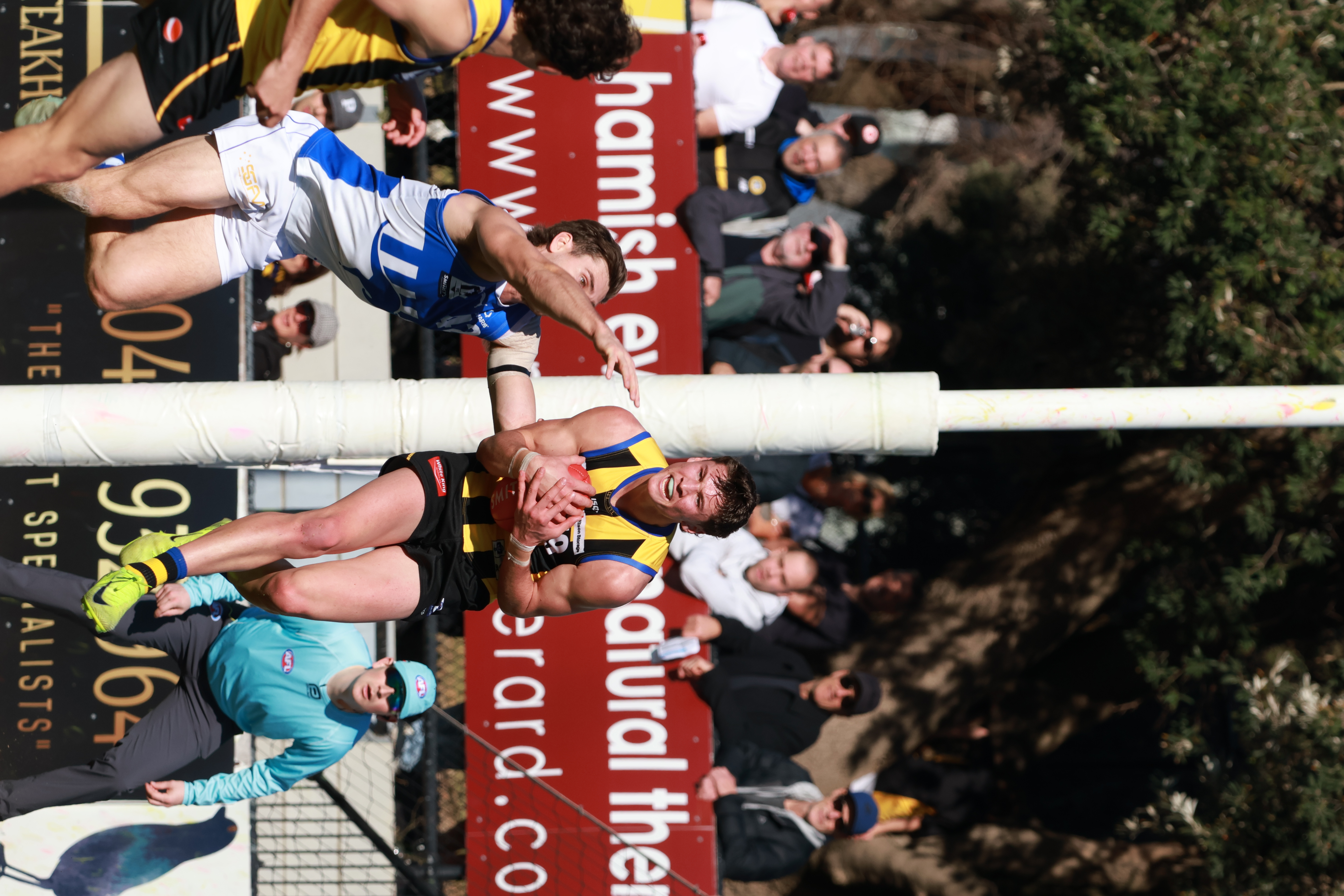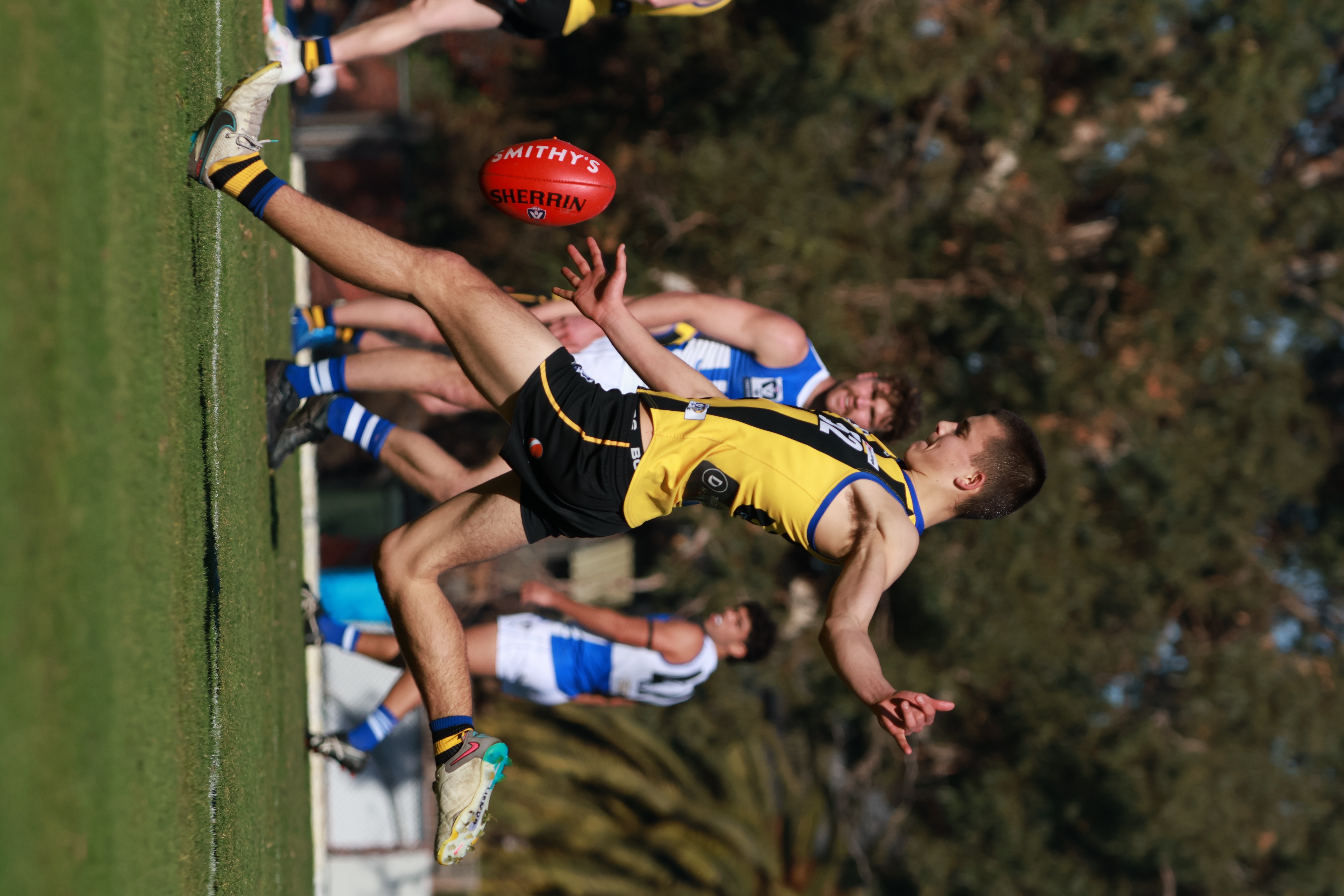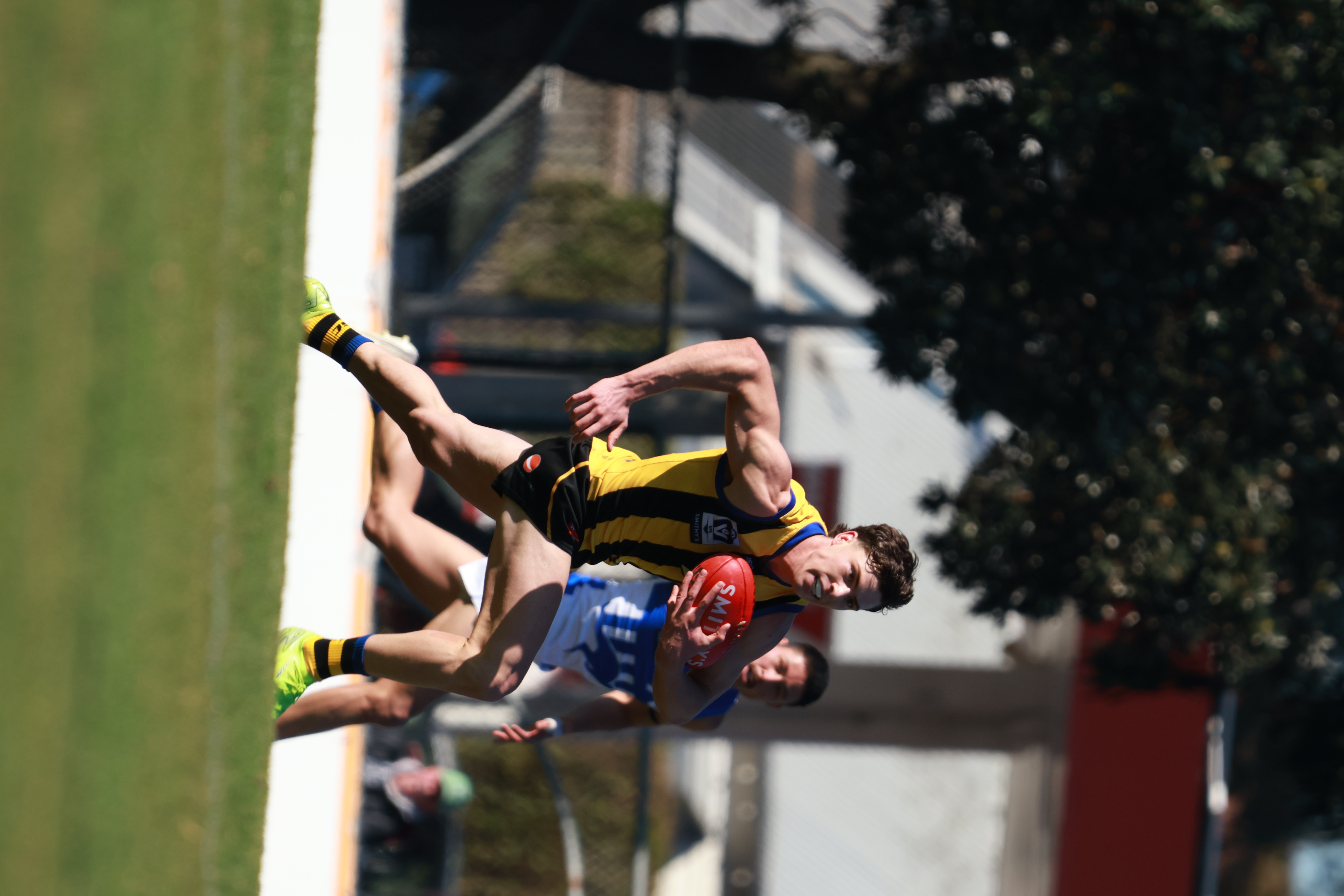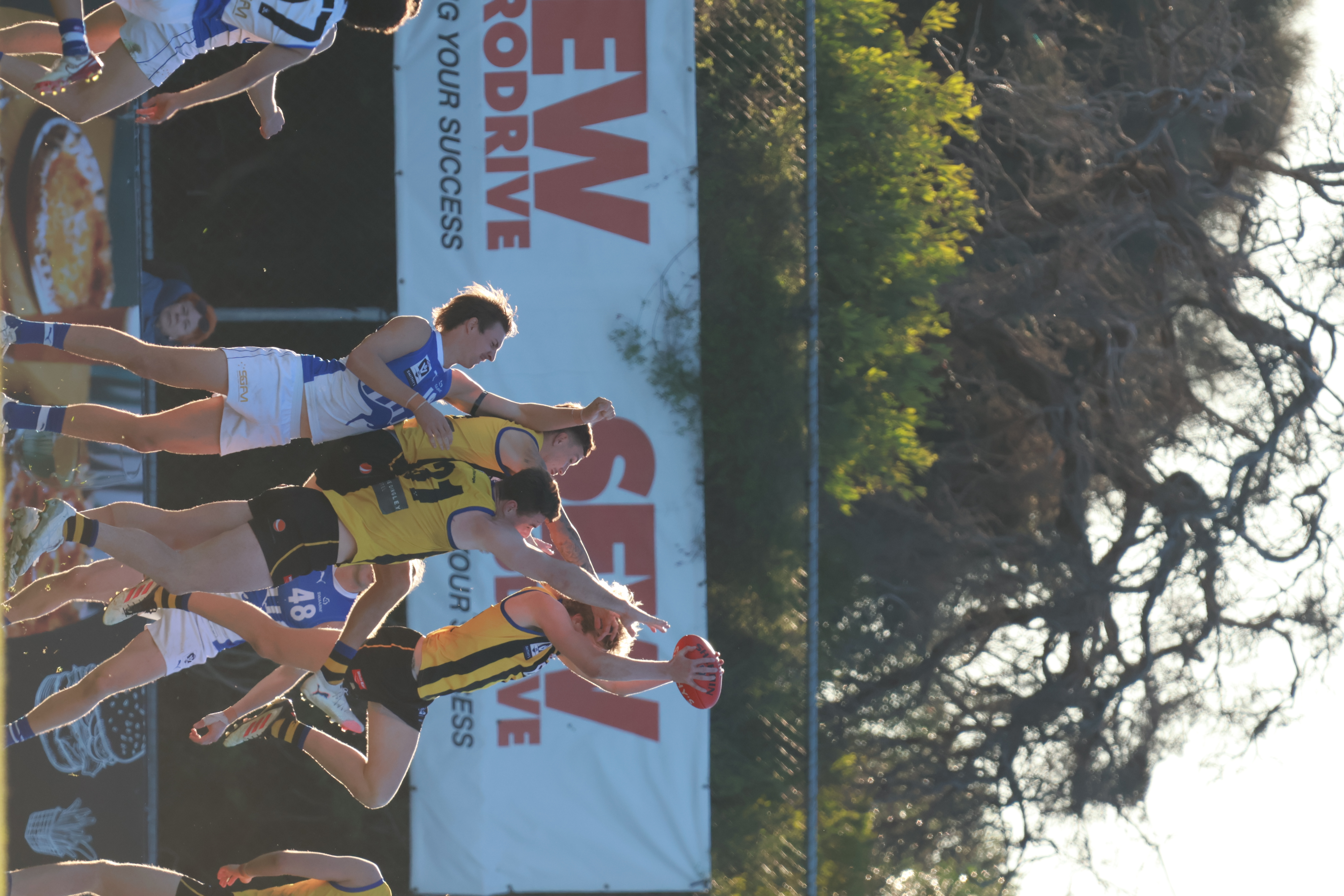 The final play of the day saw Henry take a nice mark going back with the flight in the pocket about 50 metres out. Knowing the distance would be hard to cover, he found Arie Schoenmaker who kicked a bomb from 50 metres for one final goal.