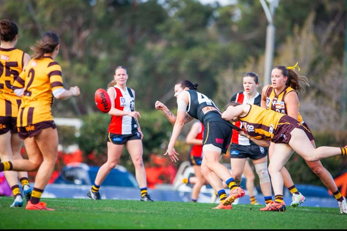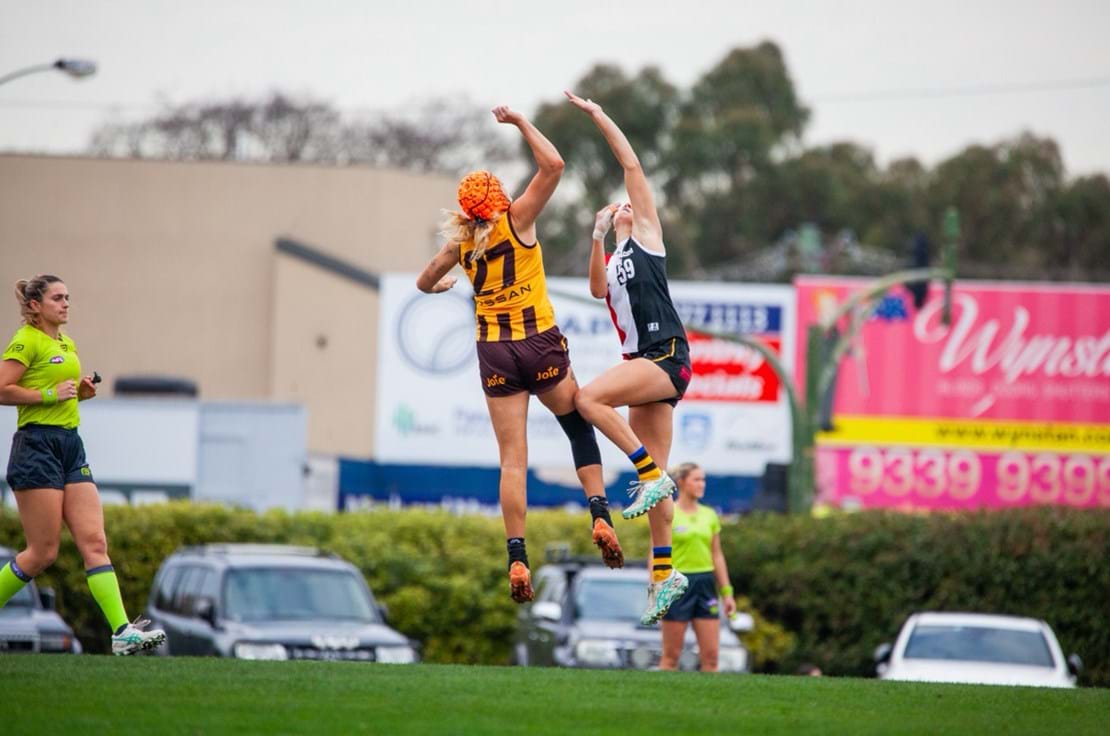 The change of ends paid immediate dividends as we quickly fired the ball into our forward 50, with some fancy footwork from Chloe Saultry nearly creating a memorable goal, but her effort narrowly missed for a behind. As was the case in our first quarter, Box Hill capitalised on our missed opportunities, and quickly opened up a 25-point lead midway through the second quarter. Imogen Evans looked to respond, firing a shot at goal that had many in the crowd thinking we'd have our first major of the day, but an unlucky bounce saw the ball collide with the post, only registering a behind. A late set shot from Makhaela Bluhm resulted in a behind, cutting the Hawks’ lead to 23 just before the halftime siren.