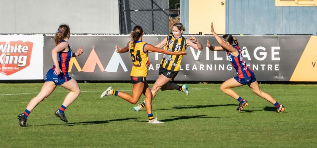 After a slightly slow start to the second quarter, it was all Zebras with momentum shifting after Arianna Clarke (11 disposals, four tackles) opened her account for the day, getting in behind the Port defenders after some inspired ball-movement up the ground. It didn’t take long to add our second, with Deanna Jolliffe (nine disposals, three marks) paid a 50-metre penalty after being hit late in a marking contest at centre half back. Her long ball inside 50 fell into the lap of Ash Patton (two goals) for her first VFLW goal for the Zebs. With our defence continually repelling Port Melbourne attacks, we maintained our lead into the main break.
