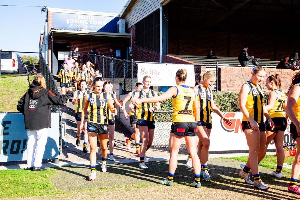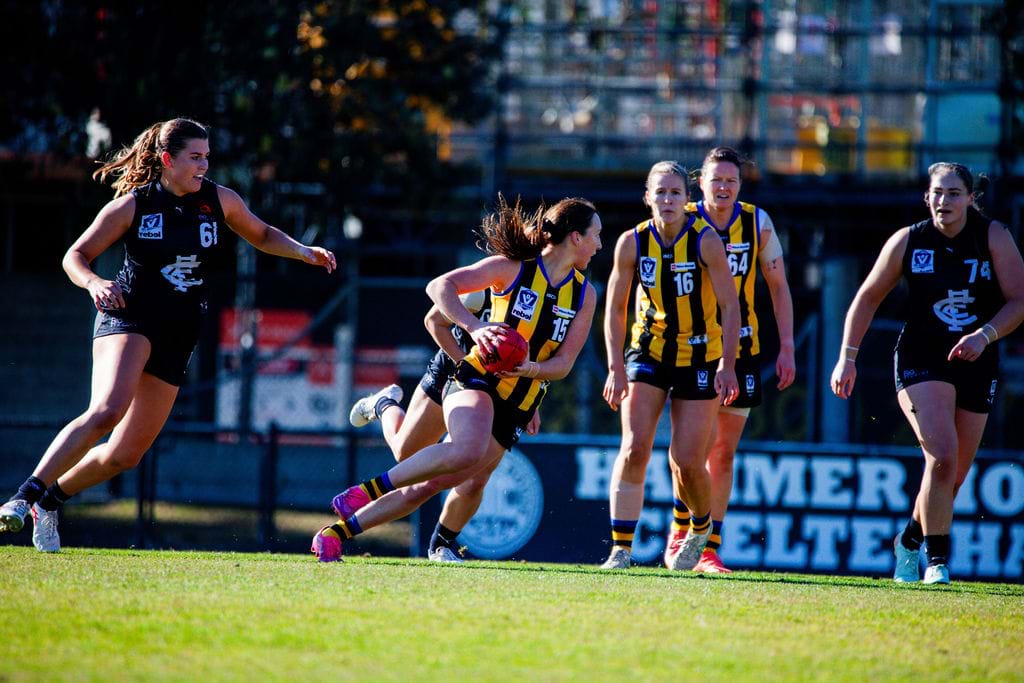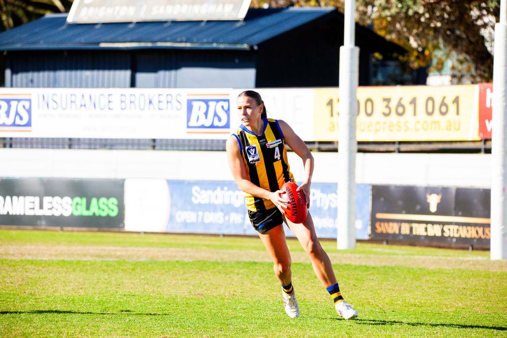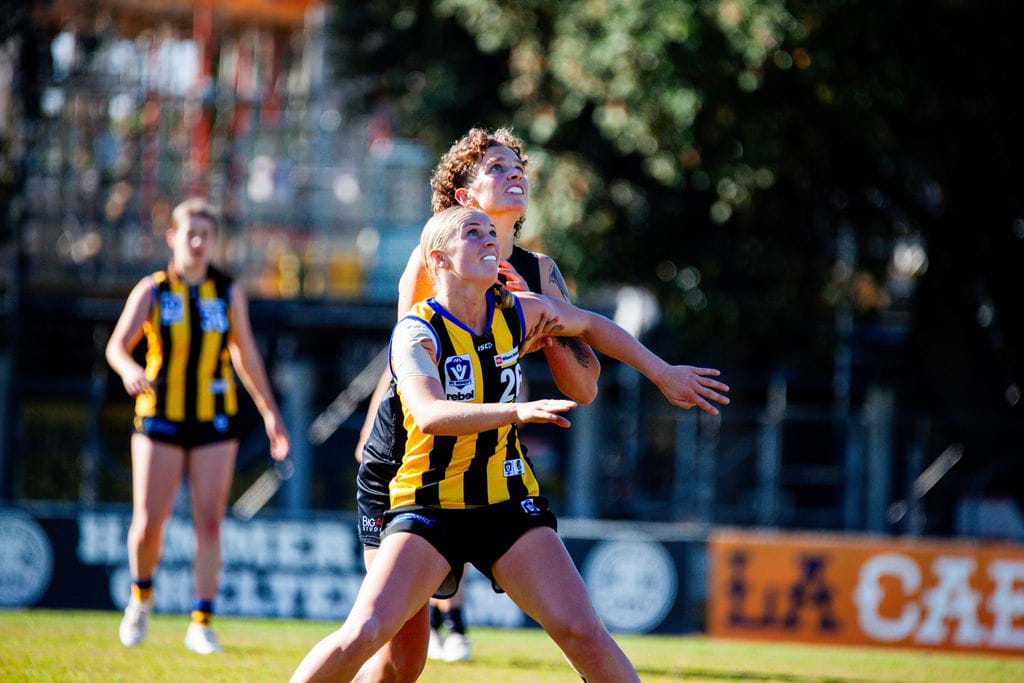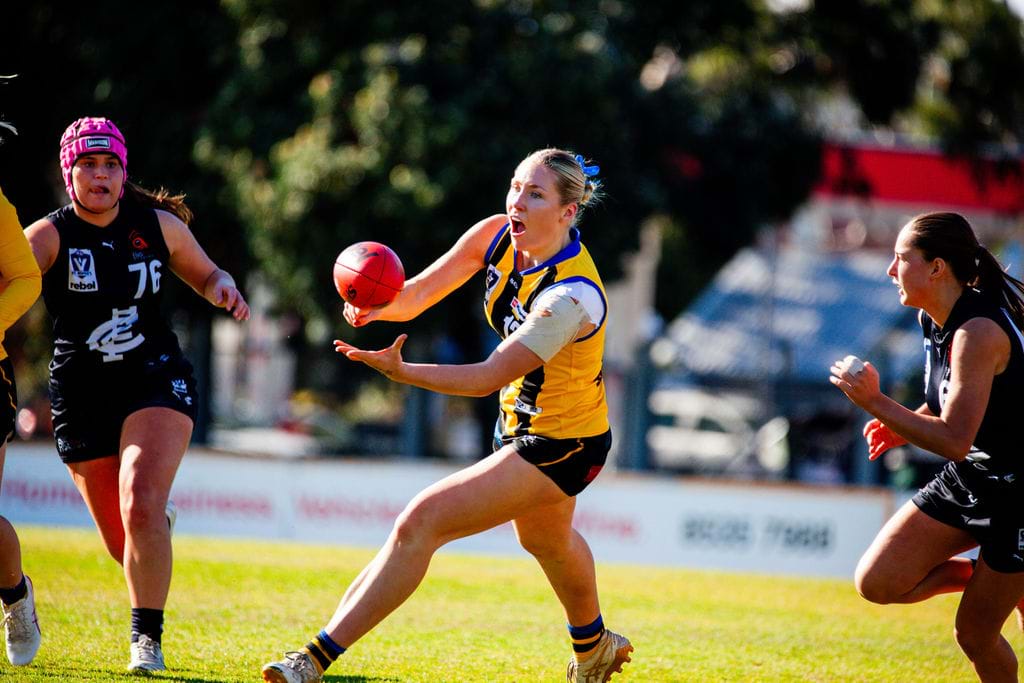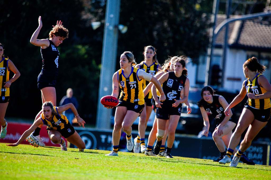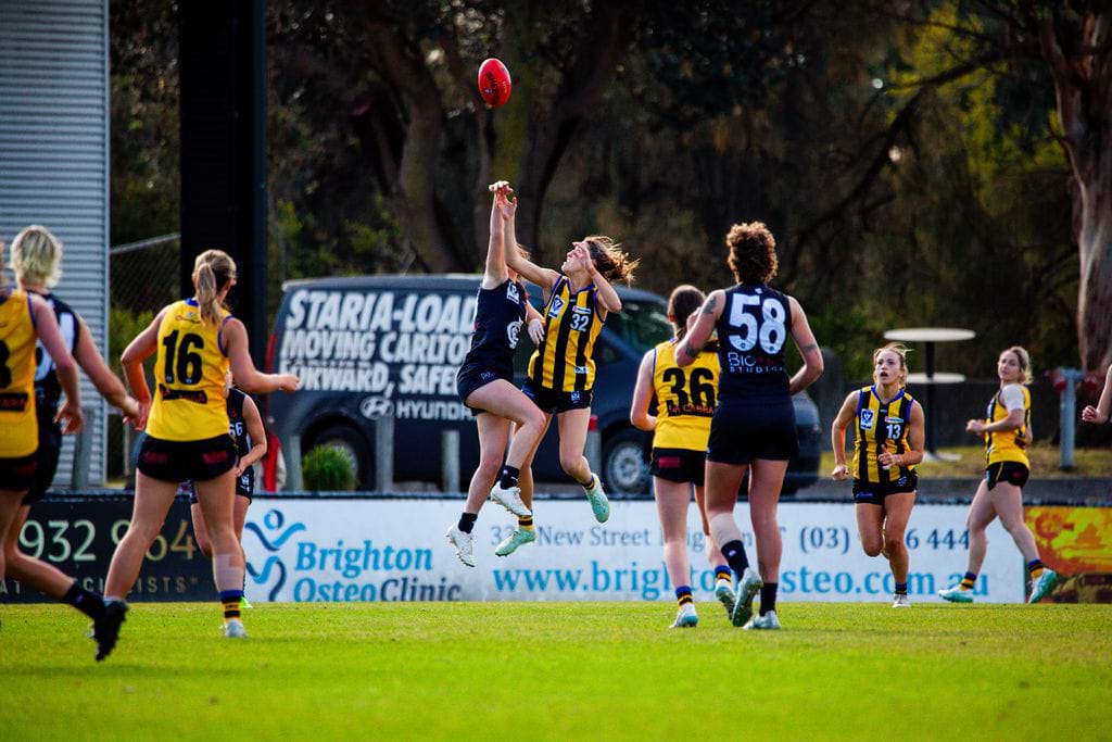 Coming into this matchup we knew we would need a strong performance to get the four points. We started off strong showing our relentless tackle pressure and ability to get numbers to the contest. Despite not getting any scores on the board early, it was a dominant start. Alexandra Hynes provided us with a strong run from our defensive 50 giving us first look at the ball to start the game. Our defence held firm as Carlton started to gain control, but the Blues still managed to kick the first of the game. We continued to work hard, and it showed, as our ability to have numbers at the back of the contest and feed handballs back was imminent. This resulted in an opportunity, which saw Arianna Clarke kick our first goal of the game. For the rest of the quarter our defence held strong not allowing Carlton to score despite their constant inside 50s.