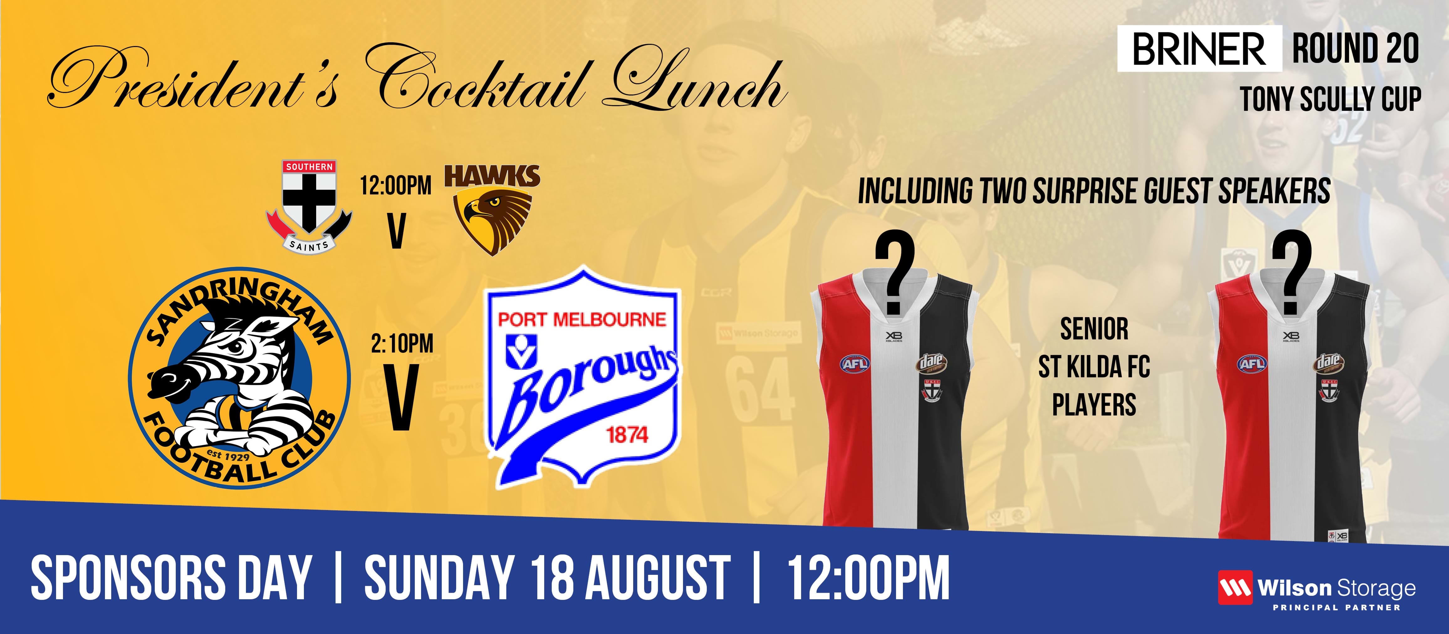 02/08/2019 | In Briner Round 20, get along to Sandy by the Bay to see both Sandringham and the Southern Saints play at Wilson Storage Trevor Barker Beach Oval for their final time in 2019 at our President's Cocktail Lunch!