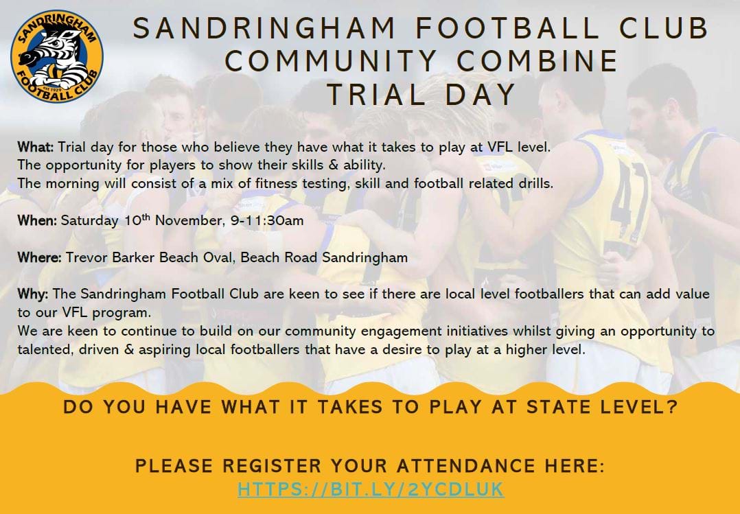 15/10/2018 | Sandringham Football Club are pleased to announce the introduction of our inaugural Community Combine Day.