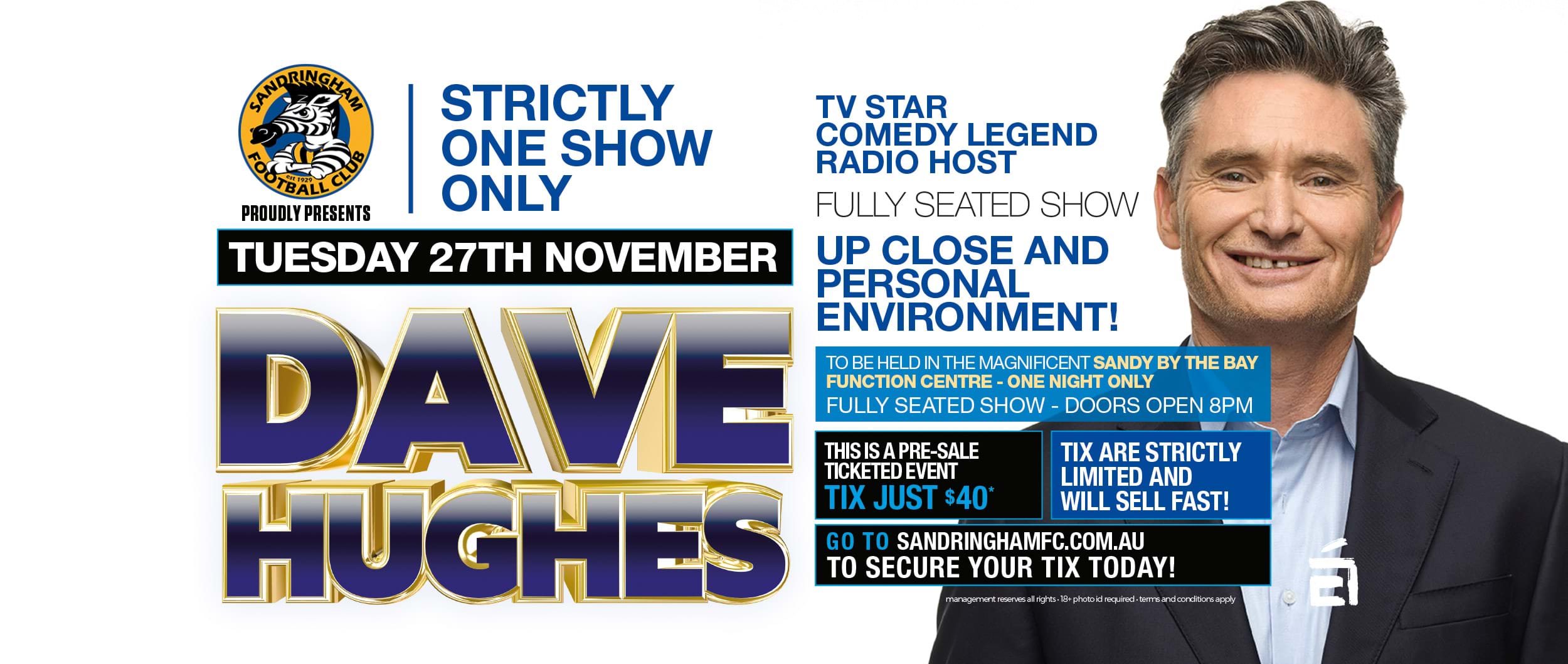 18/10/2018 | Sandringham Football Club presents Dave Hughes for a strict once off show! Come see the TV star and radio funny man for night full of laughs!